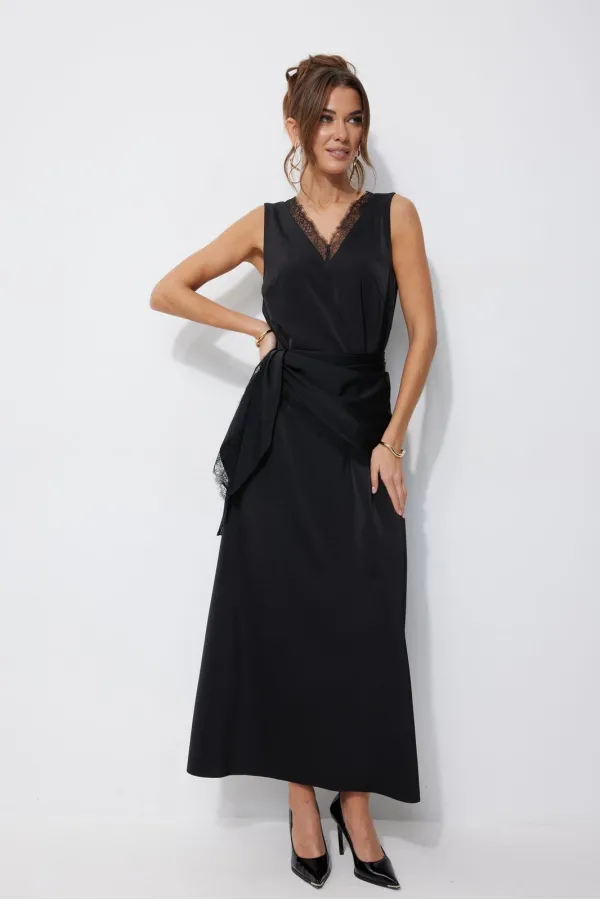Нарядное платье из струящейся ткани, длина макси. Платье свободного кроя, прямое, расширенное к низу. С глубоким V-образным вырезом горловины по переду и спинке, декорированным французским кружевом. По переду нагрудные вытачки. Без рукава. Платье дополняется платком из основной ткани. Платок декорирован по двум срезам французским кружевом. Обращаем Ваше внимание, что кружево может незначительно отличаться от фото.