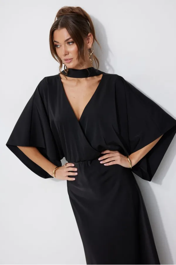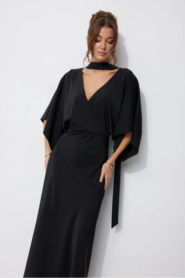 Нарядное платье из струящейся ткани, длина макси. Платье полуприлегающего силуэта. Отрезное по линии талии, с резинкой. По переду запах. По спинке глубокий V-образный вырез горловины. Рукав цельнокроеный, расширенный, длина немного ниже линии локтя. Юбка покроена по косой, силуэт расширяется к низу. Платье дополняется мягким поясом из основной ткани. Его можно использовать, как шаль, повязав на шею, либо, как пояс - на талию.