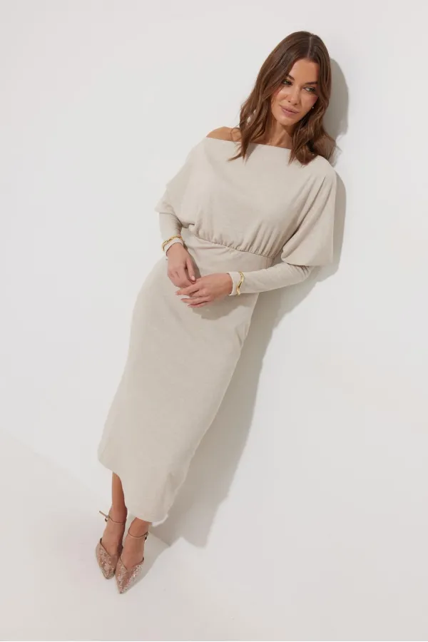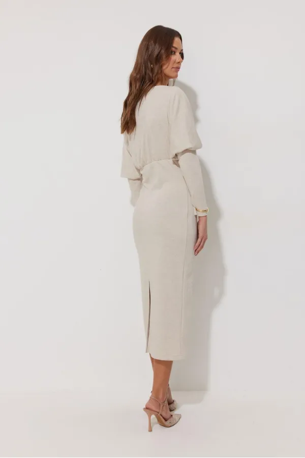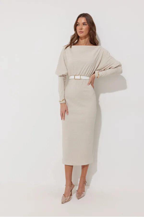 Платье полуприлегающего силуэта из трикотажного полотна. Горловина-лодочка. Рукав цельнокроеный, с подрезом выше уровня локтя и узкой длинной манжетой. По переду и спинке выше линии талии подрез, в который вставлена резинка. Обращаем ваше внимание, что ремень в комплект не входит.