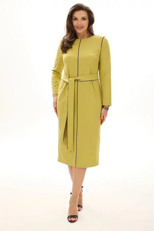 Платье полуприлегающего силуэта, зауженное книзу. По середине переда вставлен декоративный кант. По спинке средний шов с застежкой на молнию и шлицей. Рукав втачной, заужен книзу. По пройме вставлен декоративный кант. В комплекте пояс с отделкой кантом.