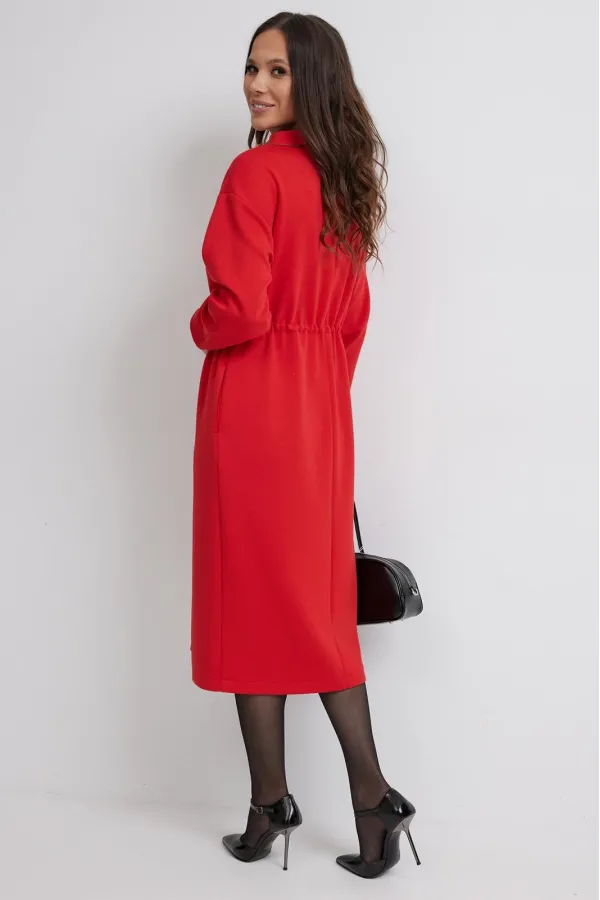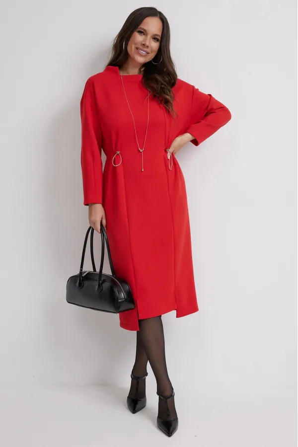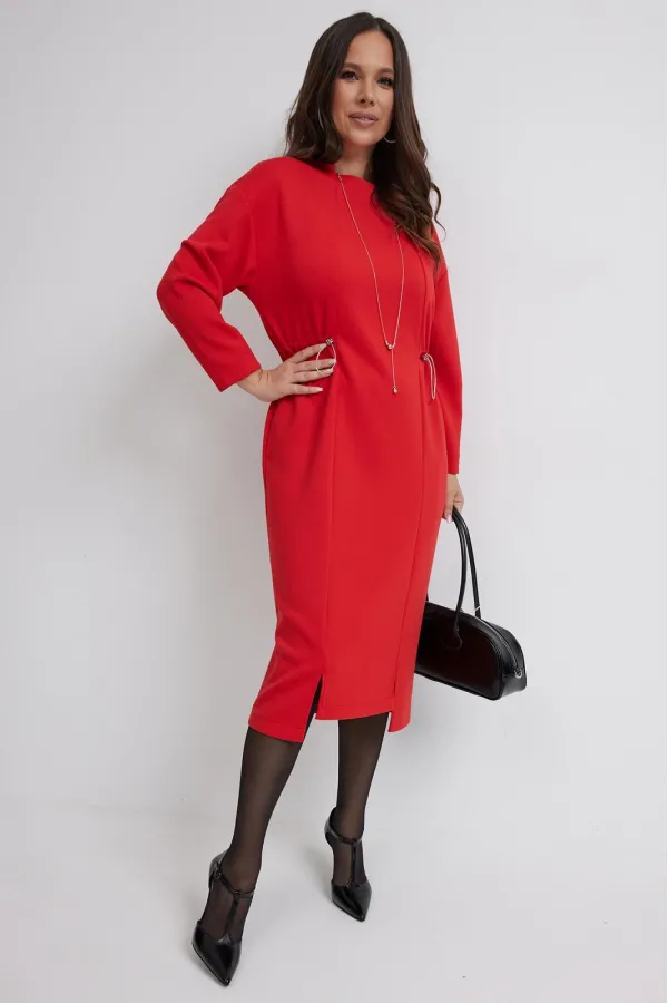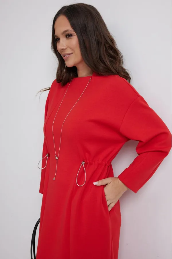 Стильное платье полуприлегающего силуэта. Выполнено из приятного к телу гладкого трикотажного полотна. Рукав длинный, слегка спущен. Цельнокроеная горловина полустойка образует красивый вырез. Платье приталено за счет скрытой кулиски с эластичной тесьмой с фиксаторами серебристого цвета. Так же платье дополнено съемным украшением из цепочек. В боковых швах расположены удобные карманы. Длина рукава 60 см. Длина платья от плечевого шва 119 см.