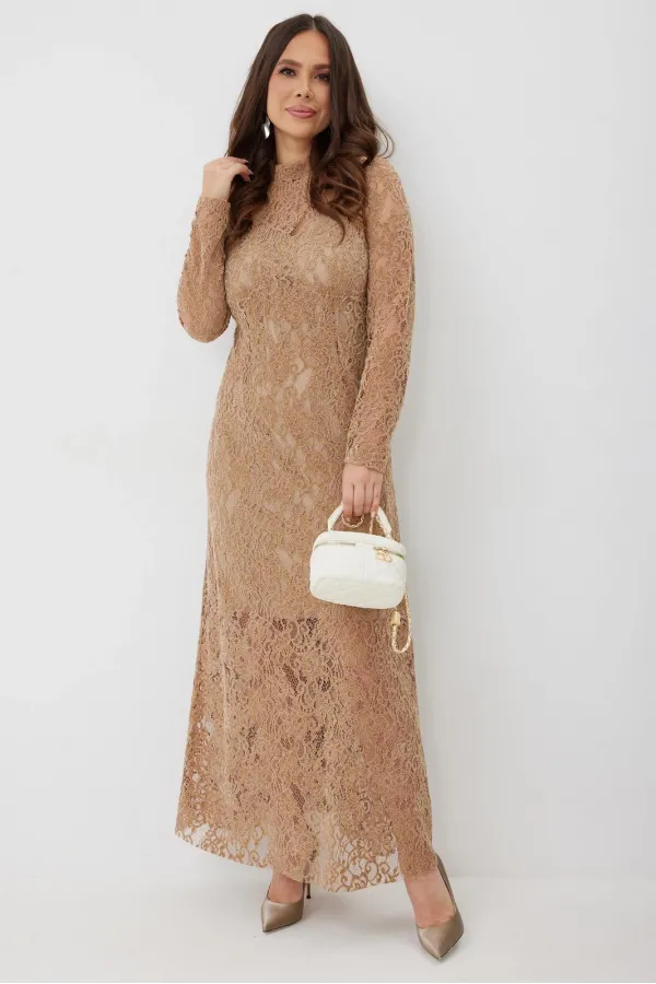 Элегантное и стильное платье макси из нежного бархатного кружева. Платье прилегающего силуэта с легким клешением книзу. Платье дополнено нижней комбинацией на тонких бретелях, выполненной из приятной к телу ткани в цвет кружева. Рукав втачной, дополнен притачным, слегка расклешенной кружевной манжетой с открытым срезом. Спереди плате с фигурным подрезом. Горловина обработана стойкой. Низ платья с открытым срезом. Длина платья от плечевого шва 146см. Длина рукава 169см.