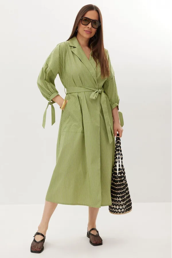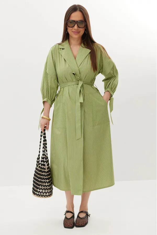 Легкое платье в полоску из натуральной хлопковой ткани. Платье двубортное свободного силуэта с центральной застежкой на кнопки. Приталено за счет съемного пояса, выполненного из основной ткани. Горловина обработана отложным воротником. Рукав со спущенной линией плеча. Низ рукава дополнен притачной манжетой с завязкой. По спинке платья красивая кокетка. Удобные боковые карманы добавляют платью непринужденности. Длина платья от плечевого шва 118 см. Длина рукава 42 см.