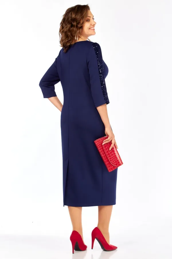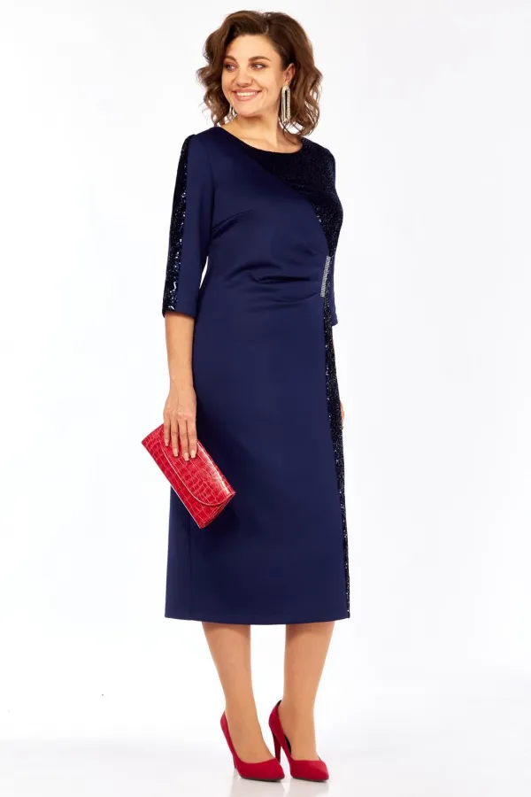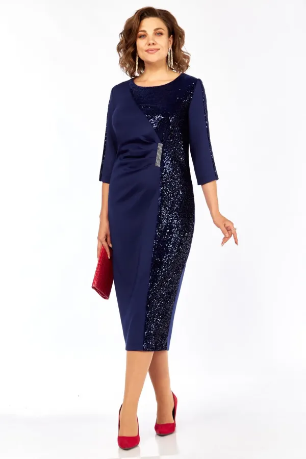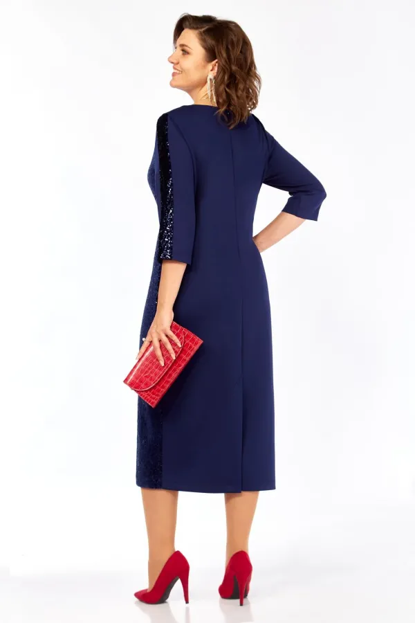 Платье женское, выполнено из 2-х видов тканей, длиной миди. Спинка со средним швом, шлицей на движение и потайной тесьмой-молнией. Перед с нагрудными вытачками из боковых швов, округлым вырезом горловины, и подрезом от правого плеча. Правая деталь переда присобирается в драпировку в области талии. Левая деталь переда из отделочной ткани- бархата с пайетками. Рукав втачной одношовный, длиной 3/4, с лампасом из отделочной ткани.