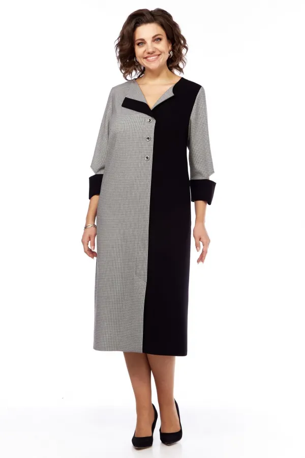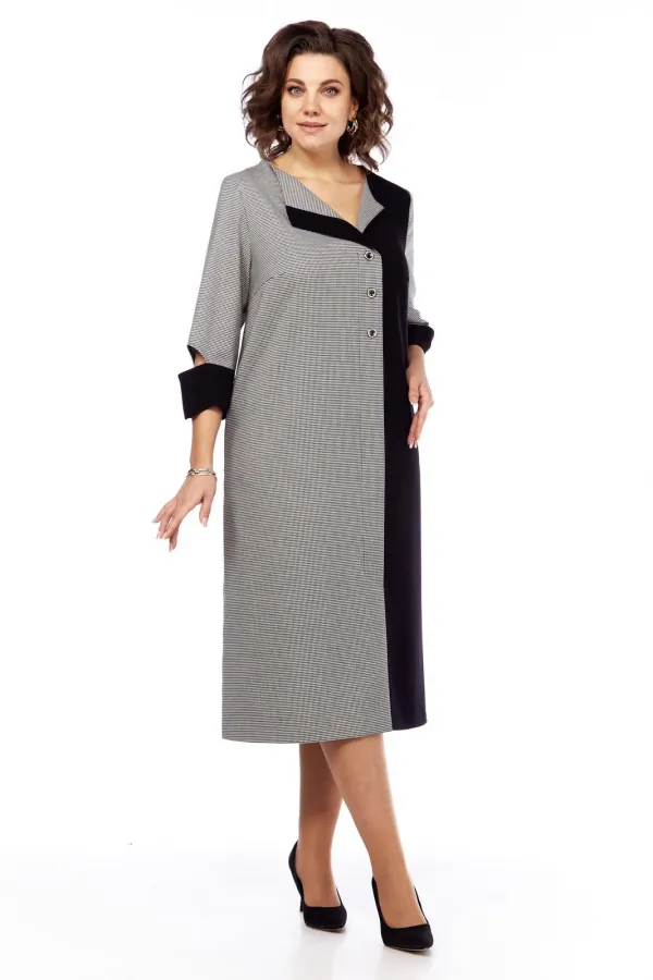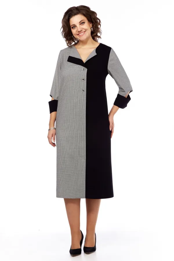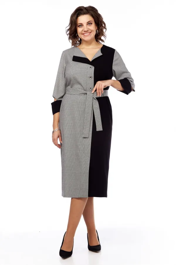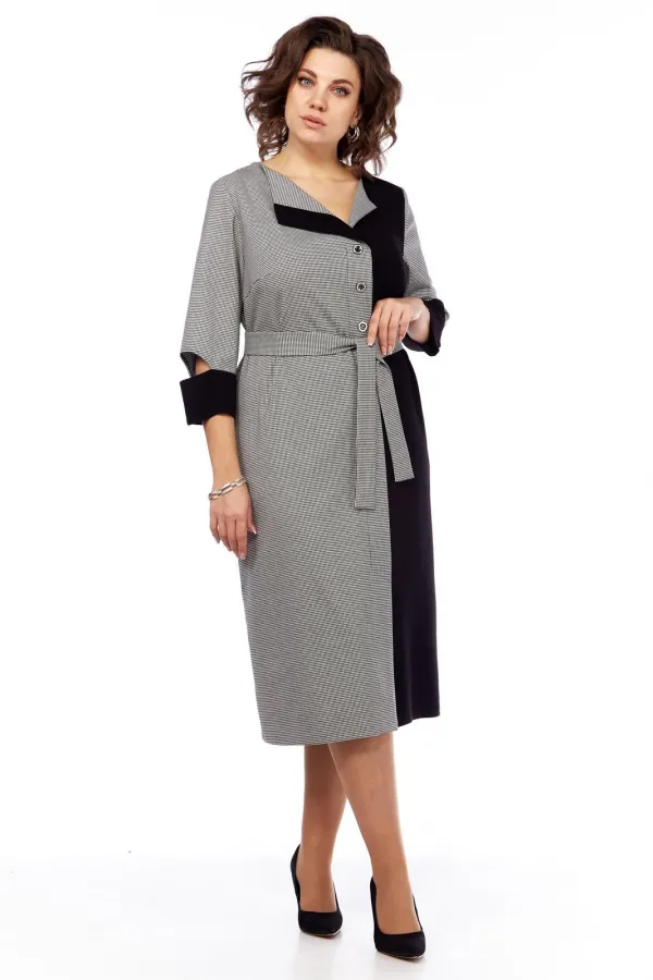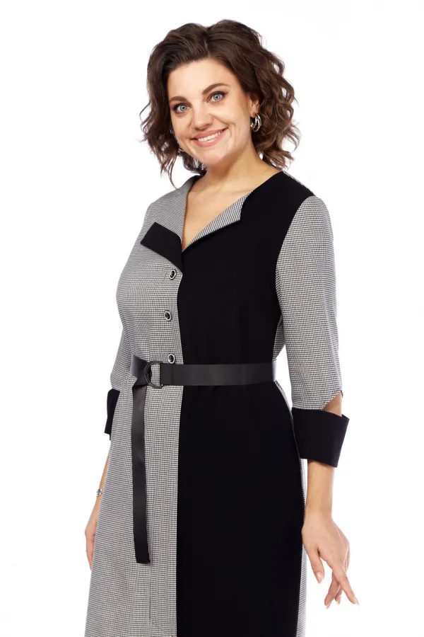 Платье женское, трапециевидного силуэта, выполненно из 2х видов ткани. Перед с ассиметричной застёжкой на 3 декоративные пуговицы и шлицей по низу, нагрудными вытачкамии из боковых швов, карманами в боковых. Спинка со средним швом. Рукав втачной, одношовный, длиной 3/4, на отрезной манжете. Между рукавом и манжетой имеется декоративное отверстие. Платье с мягкозавязывающимся поясом в комплекте.