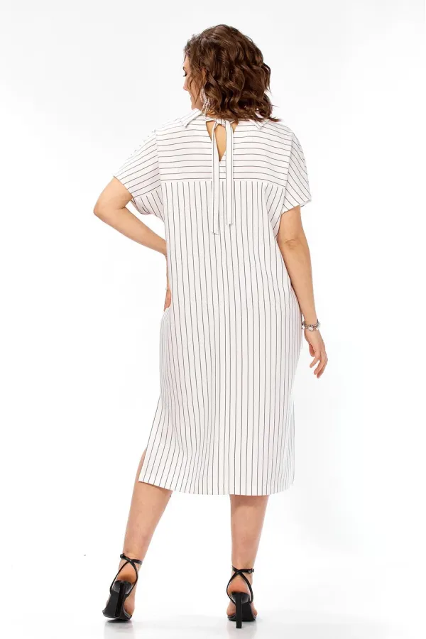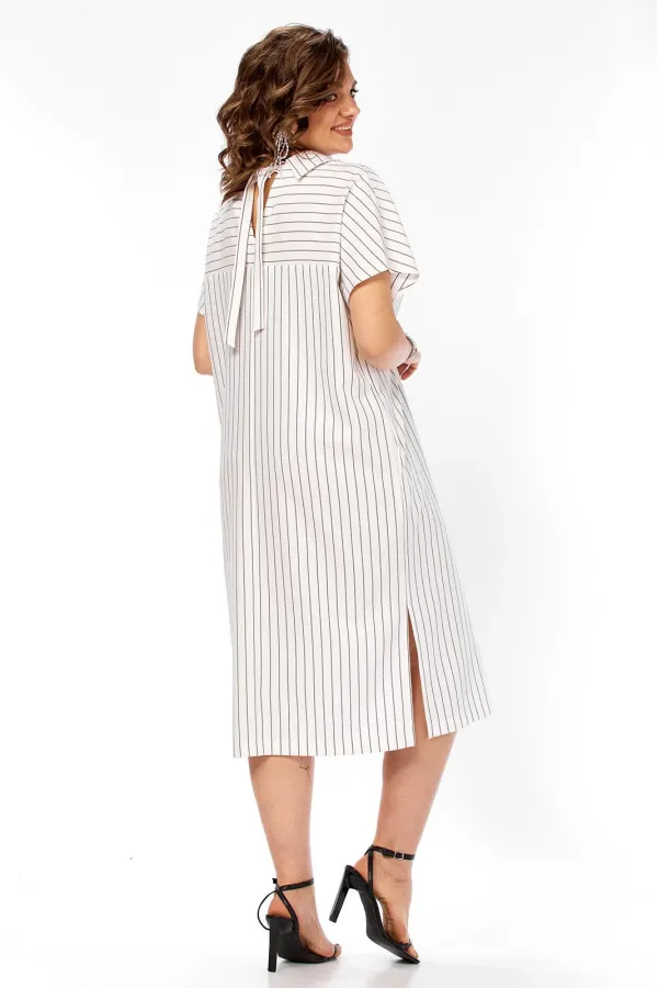 Платье женское прямого силуэта со спущенной линией плеча и карманами в боковых швах. Горловина переда оформлена воротником и планками с застежкой на три пуговицы, под планкой пришита декоративная нашивка. Спинка с отрезной кокеткой, декоративным V-образным вырезом горловин и завязками. Имеются разрезы в боковых швах.