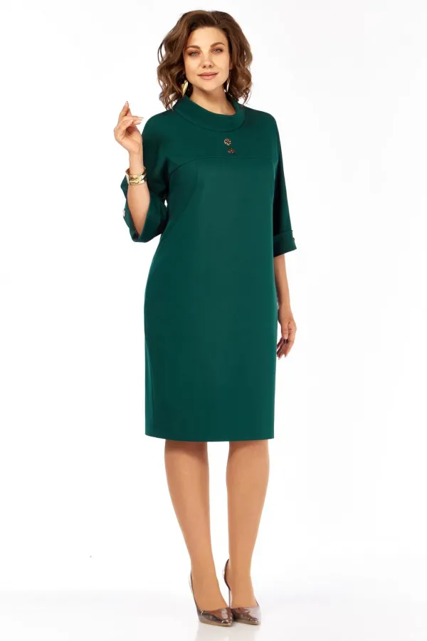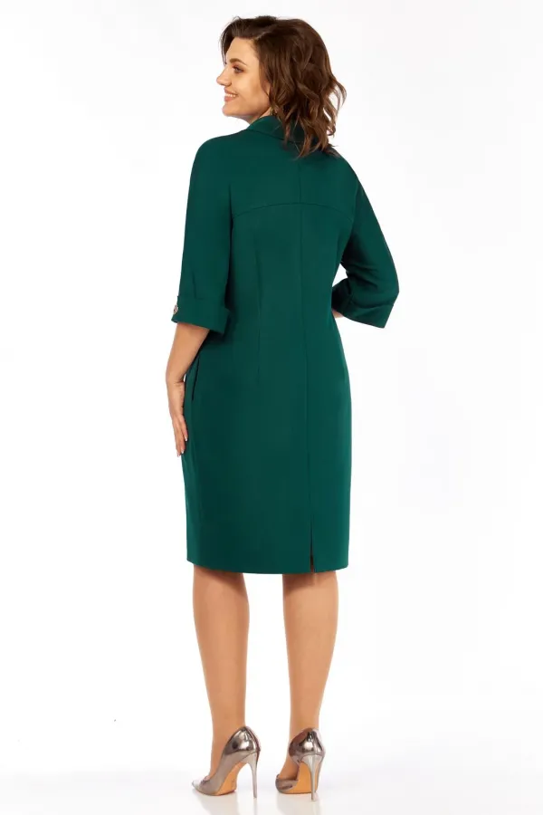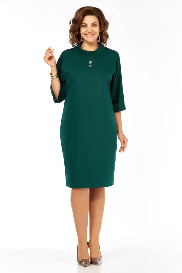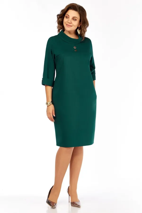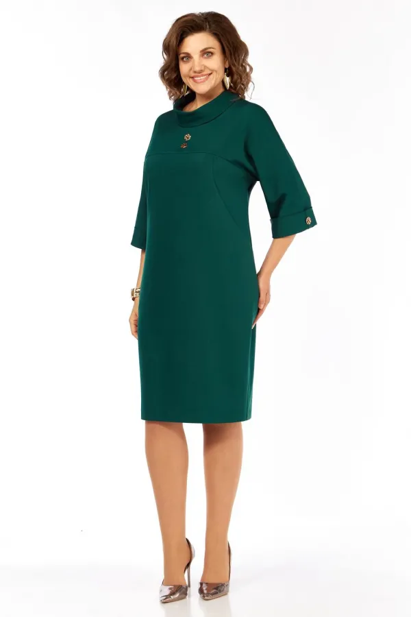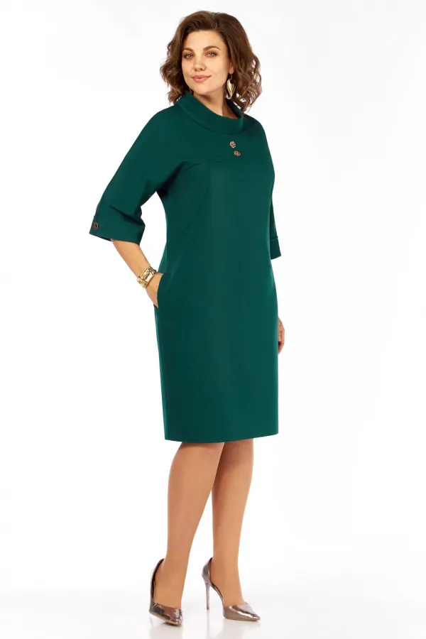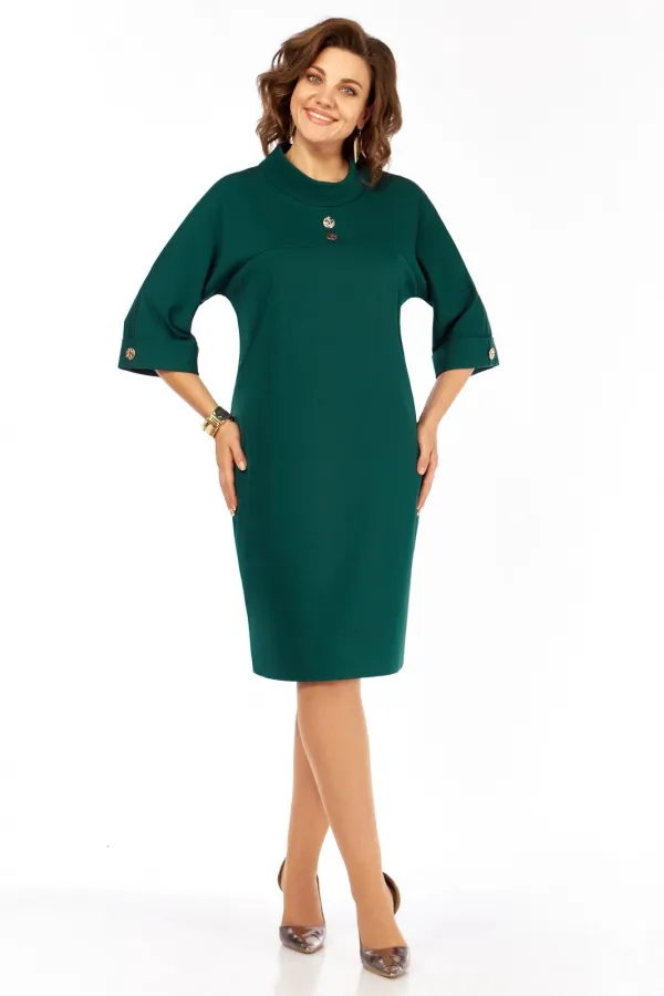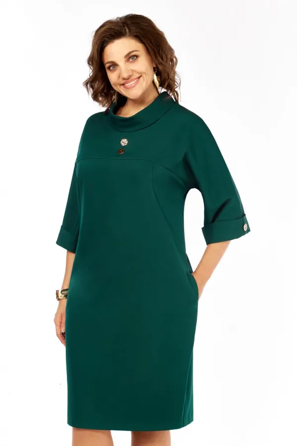 Платье женское выполнено из гладкокрашенной плательной ткани. По переду платья кокетка со средним швом, на которой расположены декоративные украшения. По спинке платья кокетка и средний шов. В боковых швах-внутренние карманы. По горловине платья-воротник хомут. По низу рукавов отложные манжеты, закрепленные декоративным украшением.