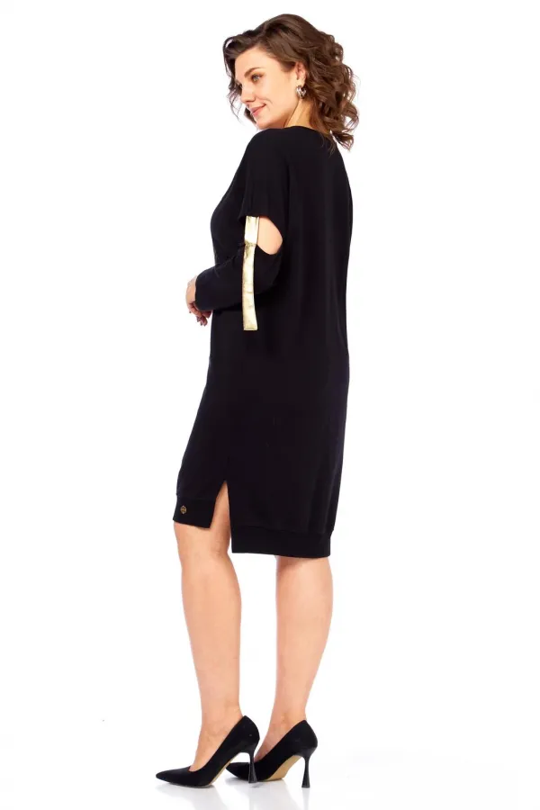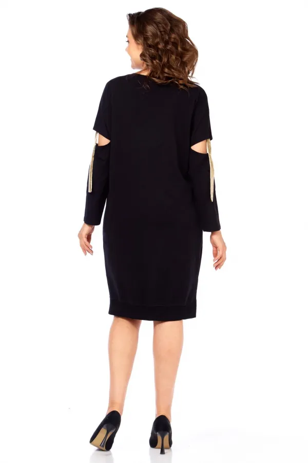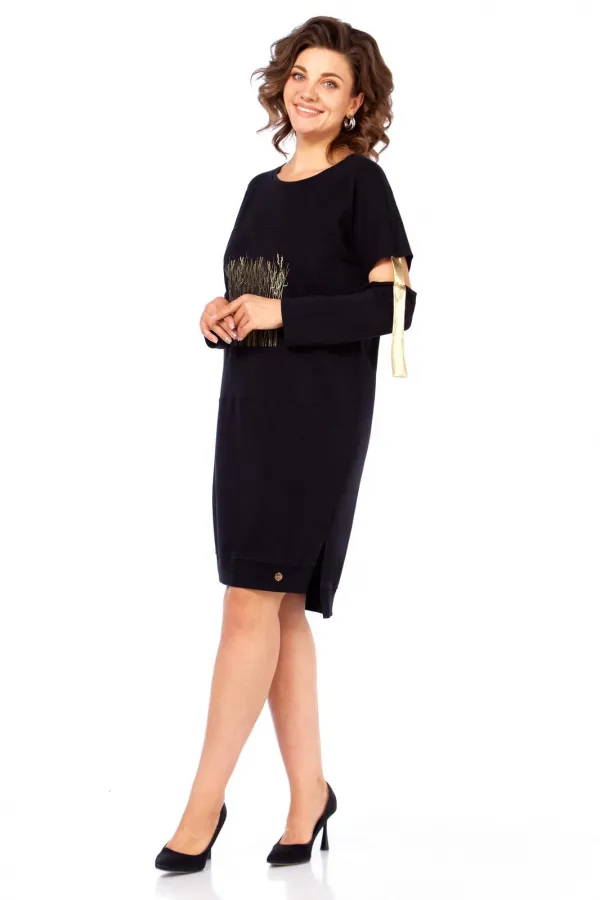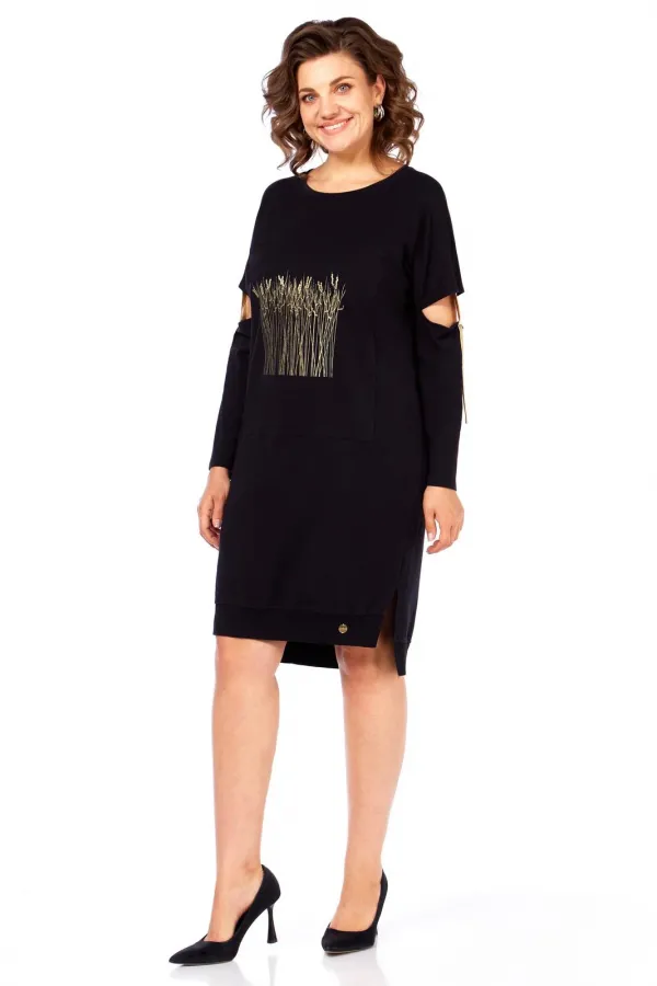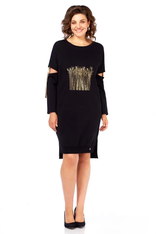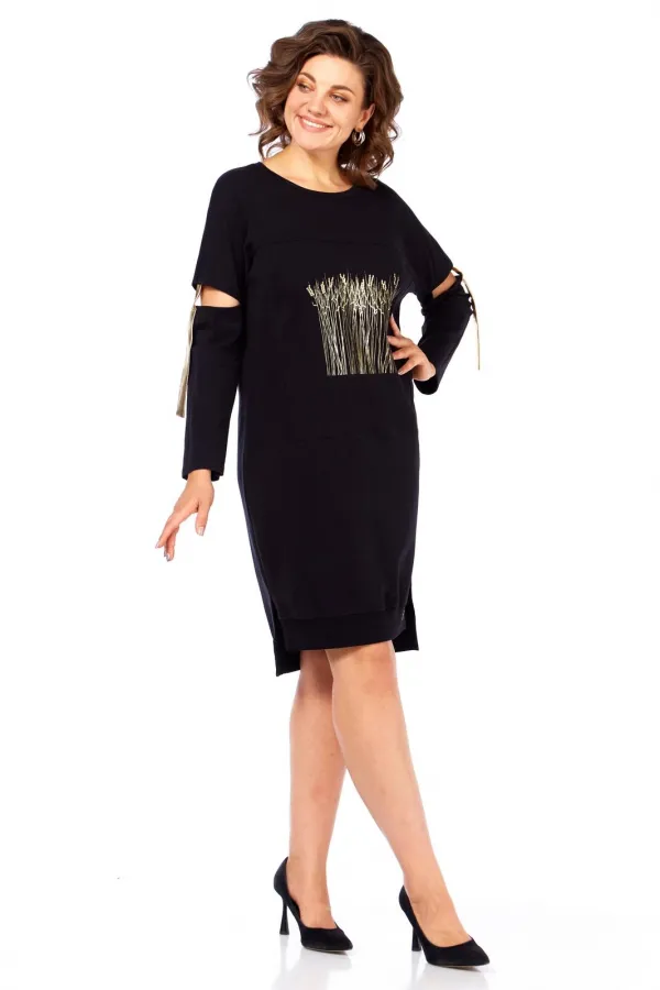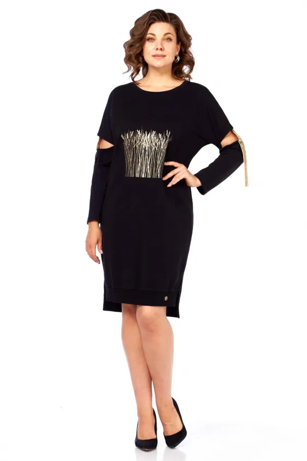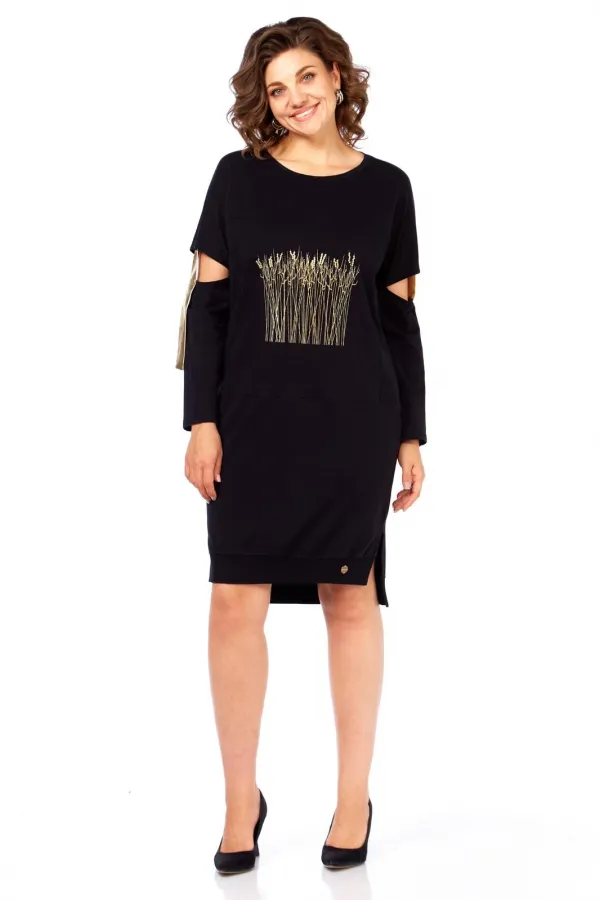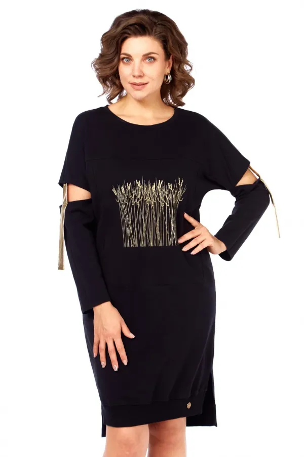 Платье женское полуприлегающего силуэта, длиной до колена. Округлый вырез горловины обработан бейкой. Перед с отрезной кокеткой, подрезом по линии бедер, и двумя рельефами от кокетки и до подреза. На центральной детали переда выполнена декоративная печать. Резинка-довяз по низу изделия и разрезы в боковых швах. Рукав цельнокроеный с декоративным разрезом в области проймы и декоративной патой. Длина платья по переду 103 см, по спинке 98 см, рукав 43 см.