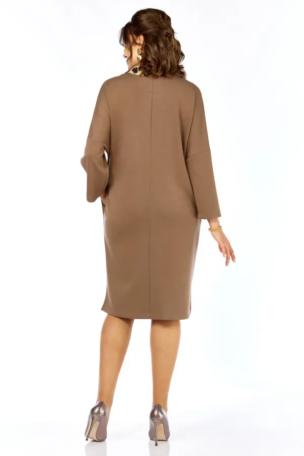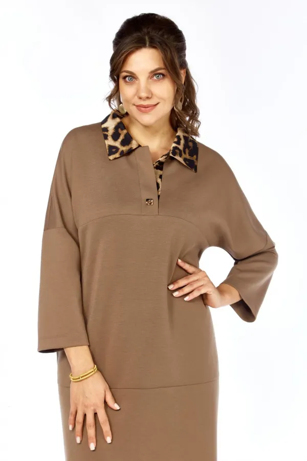 Платье женское прямого силуэта, выполнено из 2-х основных материалов(кожа+трикотаж) и отделочного полотна. Платье с рукавами длиной 3/4 на спущенной линии плеча, с разрезами в боковых швах и карманами. Перед платья с отрезной кокеткой и подрезом ниже линии бедер. Округлый вырез горловины, отрезные планки до подреза по переду и стояче-отложной воротник. На верхней планке пришита декоративная пуговица. Воротник и нижняя планка из отделочного материала. Спинка платья со средним швом.