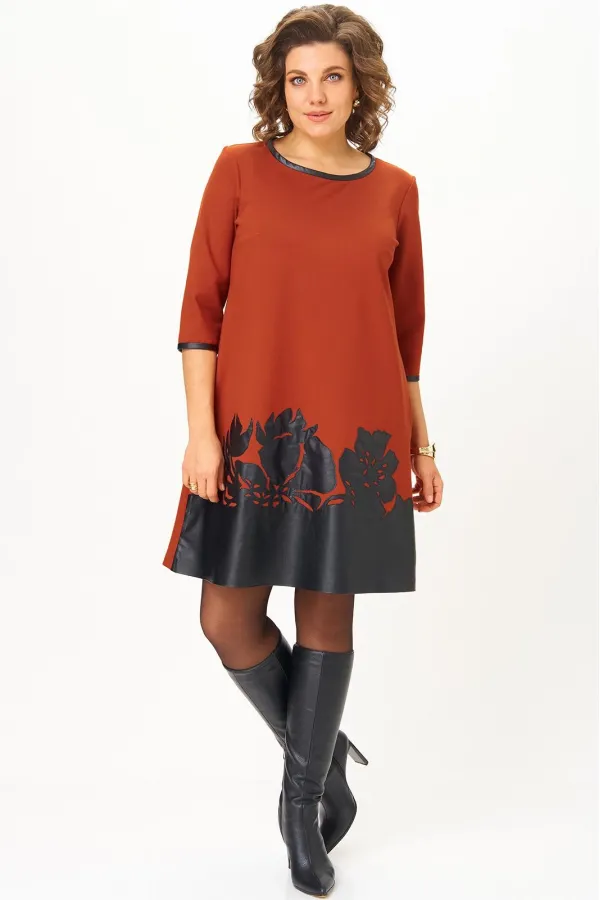 Модель с трапециевидным силуэтом длиной чуть выше колена идеально подчеркивает женственные линии и визуально стройнит фигуру. Втачные рукава 3/4 и обработка бейкой из эко-кожи по низу рукавов и вороту придает изделию особую изысканность и завершенность.