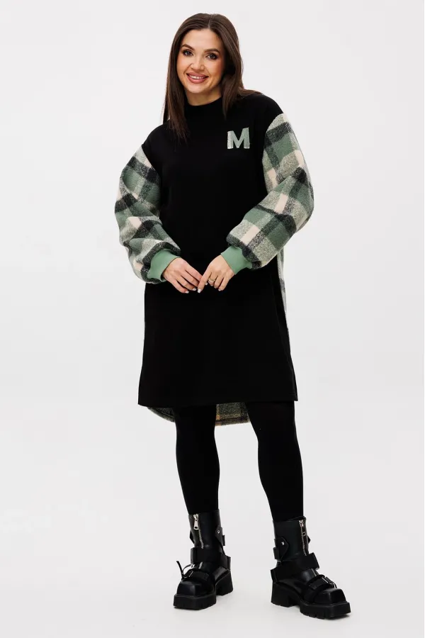 Женское повседневное платье прямого полуприлегающего силуэта, длиной до колена. Платье из двух скомпонованых видов материалов: перед однотоный 3-х ниточный трикотаж, спинка с рукавами — крупная сетка в тон. Вырез горловины круглый на трикотажной планке; плечо спущенное, рукав-втачной, одношовный, длинный. Перед и спинка цельные, по спинке от горловины небольшая встречная складка, удлиненный фигурный низ. По низу боковых швов — два разреза. Украшением платья служит небольшая нашивка. Платье отлично сочетается с любым видом обуви и может смело комбинироваться с джинсами и легинсами.