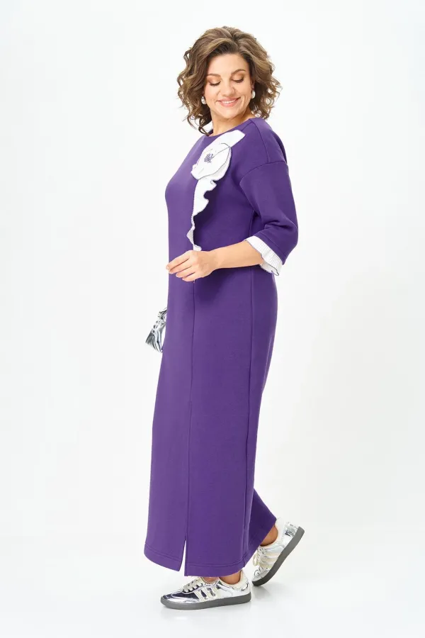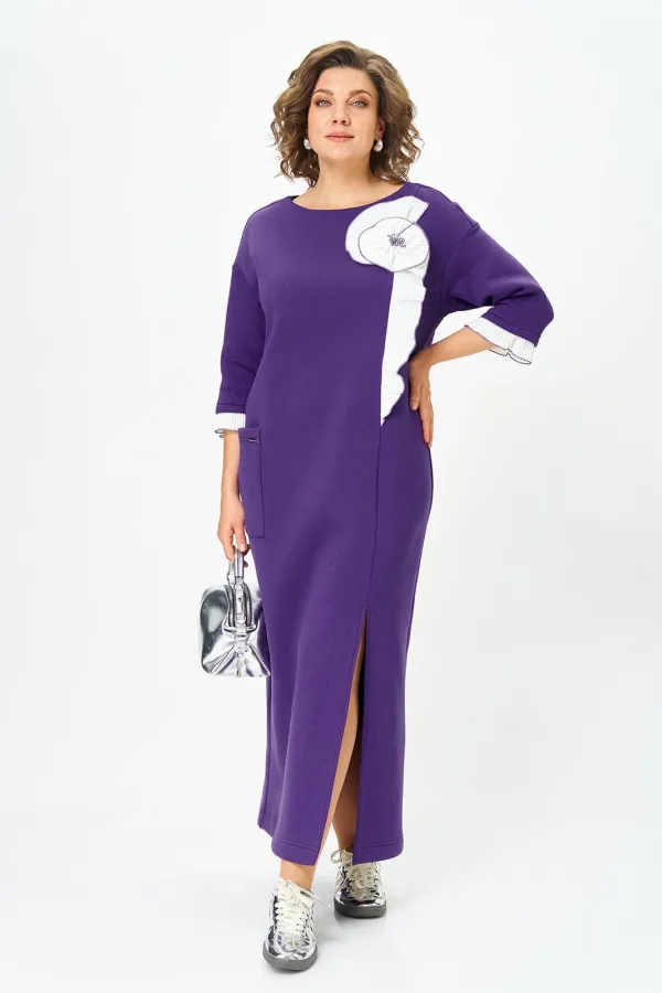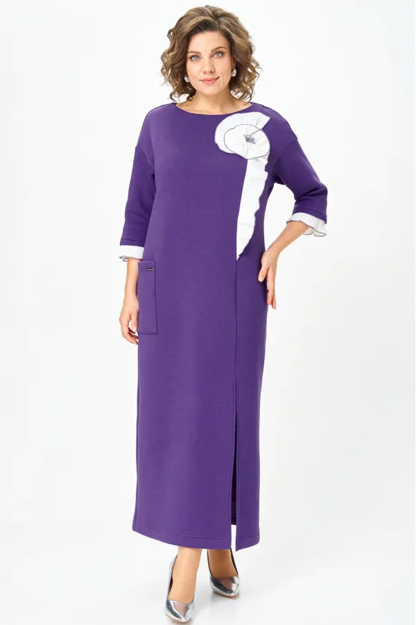 Спинка цельная, а передняя часть украшена нагрудными вытачками и левым рельефом с разрезом внизу. В рельеф вставлен декоративный волан-цветок из отделочной плиссеровки, который служит ярким акцентом и добавляет модели оригинальности. Длина платья — 7/8, что делает его универсальным для различных сезонов и ситуаций. По правой стороне расположен накладной карман — практичный элемент, дополняющий дизайн и удобство.