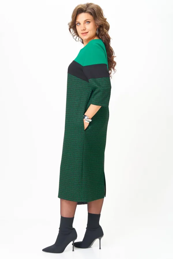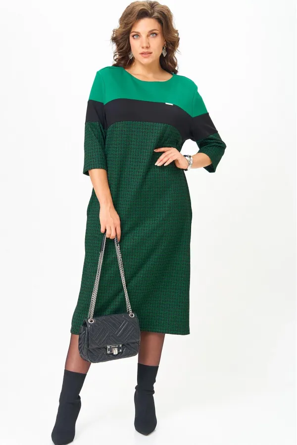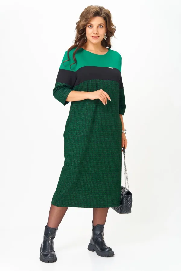 Продуманный крой скрывает лишнее и подчёркивает достоинства, а мягкий трикотаж обеспечивает комфорт на весь день. Преимущества модели: Комфортный плотный трикотаж — не просвечивает, не мнётся, держит форму. Светло-зеленая верхняя вставка подсвечивает лицо, создавая эффект сияния кожи. Контрастная деталь по груди визуально вытягивает силуэт и уравновешивает пропорции. Прямой силуэт подходит для любого типа фигуры Разрез сзади добавляет женственности и свободы движения. Универсальный стиль — для офиса, прогулок и повседневной элегантности. Платье, которое работает на ваш образ: делает моложе, стройнее и увереннее. Длина платья по спинке 114 см +- 1 см, длина рукава 40 см +-1 см. Изделие подойдет на рост 170 см.