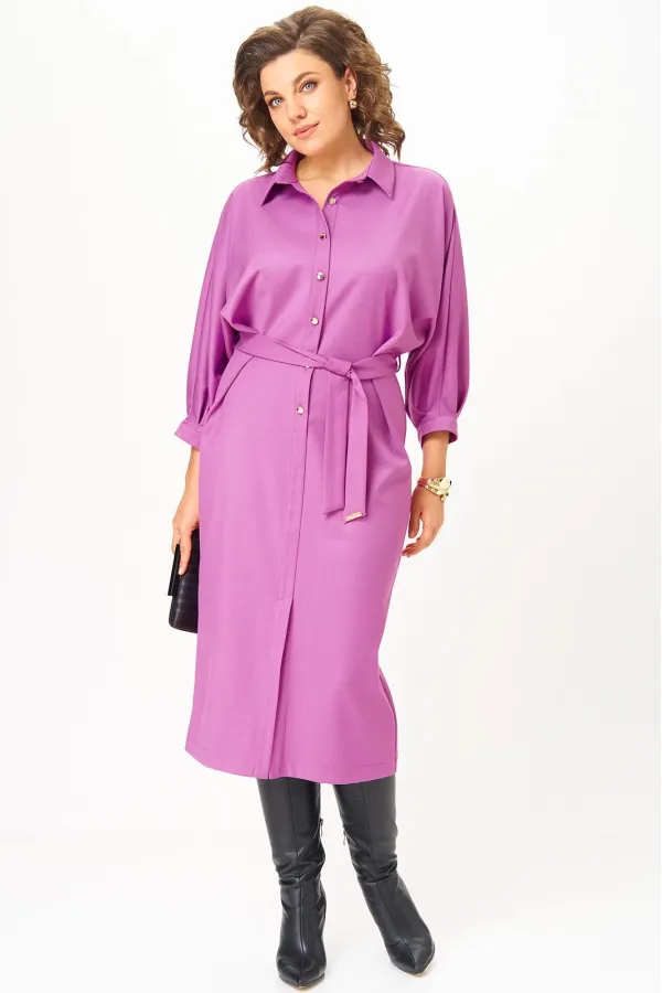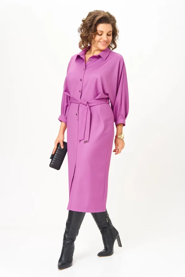 Модель с отрезной линией по талии и съемным поясом красиво подчеркивает женственность и стройность. Рукава 3/4 с аккуратными манжетами по низу добавляют образу изящества и внутренней гармонии. Прямой, немного зауженный к низу силуэт с небольшим разрезом — создаёт баланс между элегантностью и практичностью.