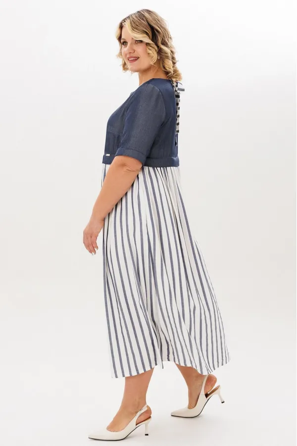 Юбочная часть в вертикальную полоску визуально вытягивает силуэт и добавляет лёгкости. Свободный крой дарит комфорт, не подчёркивая лишнего. Сзади — аккуратный бант, который добавляет образу нежности и женственности.