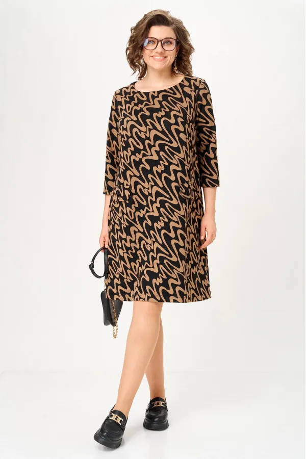 Свободный А-образный крой деликатно скрывает нюансы фигуры и красиво движется в шаге. Рукав 3/4 делает платье идеальным для переходного сезона, а декоративные клапаны «заземляют» принт, добавляя образу собранности и универсальности. Сзади аккуратная молния для удобной посадки.
