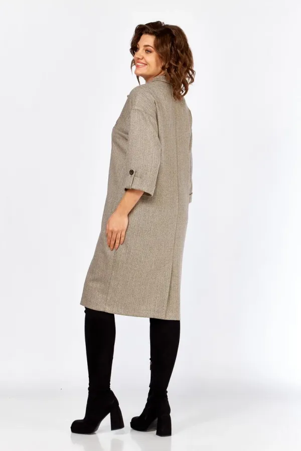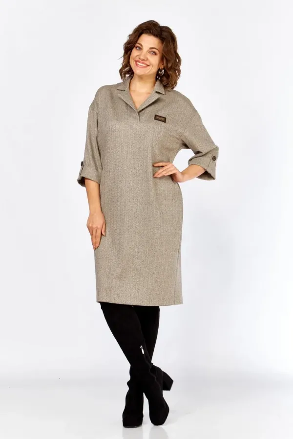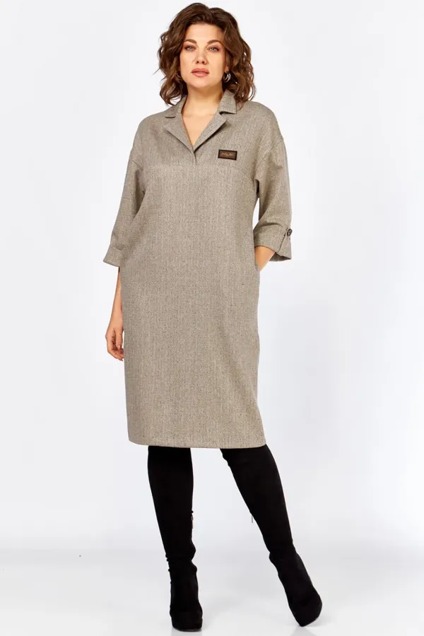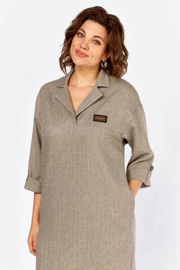 Платье полуприлегающего силуэта, длины миди, без подкладки. На полочке обработана отрезная кокетка, воротник отложной, пиджачного типа. Плечи изделия приспущены, рукава укорочены и заканчиваются манжетой, по низу пришит декоративный элемент (в виде паты), свободный край которого закреплен к рукаву пуговицей. Слева на груди – декоративный пришивной элемент (нашивка). По спинке шов, который заканчивается шлицей, для удобства при ходьбе. В боковых швах обработаны карманы-хулиганы.