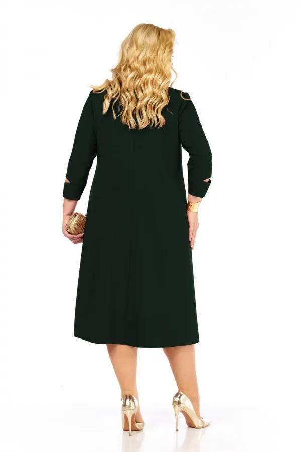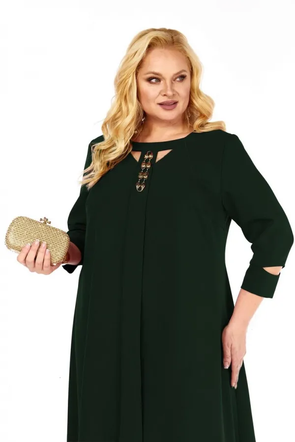 Нарядное платье длины миди, А-образного силуэта, без подкладки. Вырез горловины V-образный c дополнительными декоративными деталями – планками, украшен нашивной золотой деталью. На полочке спереди застрочена вертикальная складка, которая создает эффект удлинения силуэта. Рукава длиной ¾, с декоративными вырезами на внешней стороне руки. С карманами-хулиганами в боковых швах.