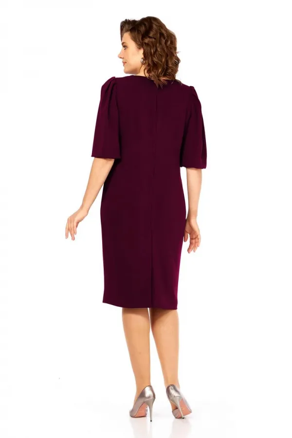 Платье-футляр, полуприлегающего силуэта, длины миди, без подкладки. Рукава – «фонарики», горловина круглая. Объемное украшение (брошь) пристегивается. По спинке шов, в котором обработана застежка-молния и шлица для удобства при ходьбе.