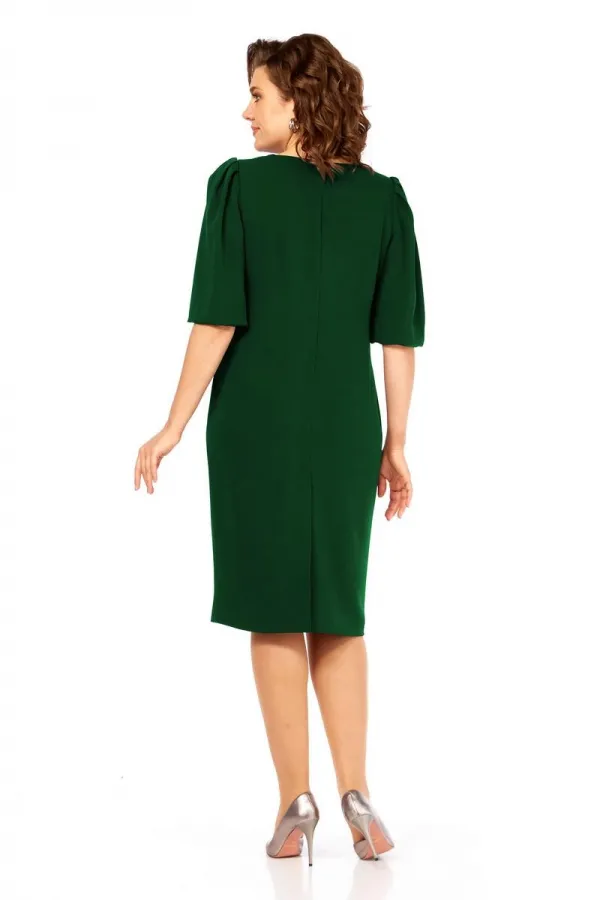 Платье-футляр, полуприлегающего силуэта, длины миди, без подкладки. Рукава – «фонарики», горловина круглая. Объемное украшение (брошь) пристегивается. По спинке шов, в котором обработана застежка-молния и шлица для удобства при ходьбе.