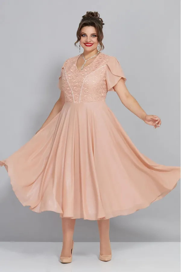 Нарядное женское платье, прилегающего силуэта, выполнено из шифона с блеском и кружева в тон, на трикотажной подкладке. Лиф платья отрезной по линии талии выполнен из кружева, с рельефами, по рельефу вставлен кант со стразами. Горловина V-образной формы, обтачена подкладкой, рукав втачной, укороченный, выполнен из шифона. Юбка расклешенного силуэта, выполнена из шифона, на трикотажной подкладке, спинка идентична полочке, со средним швом и рельефами, в среднем шве вставлена потайная молния. Эффектное, нарядное платье прекрасно дополнит ваш образ на любом мероприятии! Длина изделия 125 см. в 52р. Ширина груди- 53см, Ширина талии -45см, Ширина бедер- 66см, длина рукава- 20см., ширина рукава 24см.