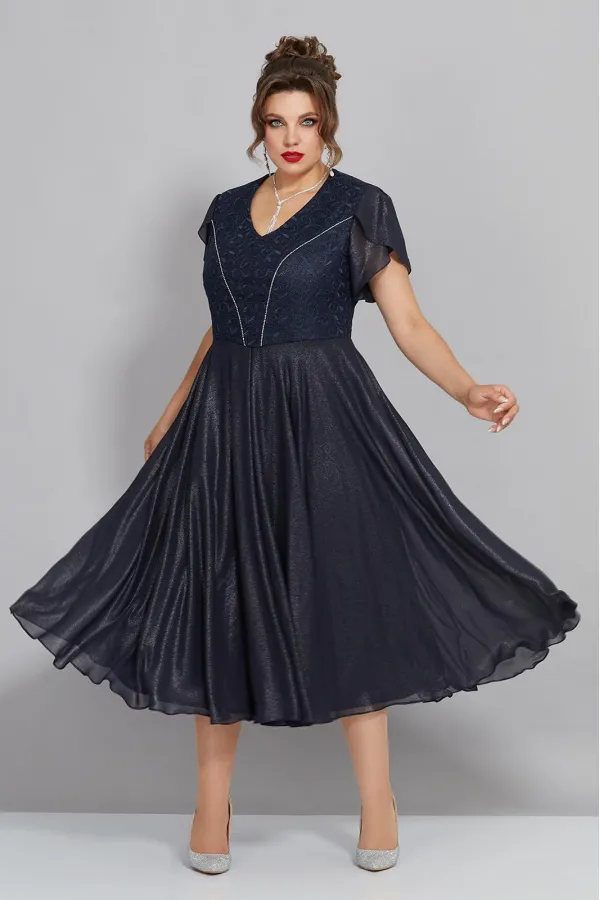Нарядное женское платье, прилегающего силуэта, выполнено из шифона с блеском и кружева в тон, на трикотажной подкладке. Лиф платья отрезной по линии талии выполнен из кружева, с рельефами, по рельефу вставлен кант со стразами. Горловина V-образной формы, обтачена подкладкой, рукав втачной, укороченный, выполнен из шифона. Юбка расклешенного силуэта, выполнена из шифона, на трикотажной подкладке, спинка идентична полочке, со средним швом и рельефами, в среднем шве вставлена потайная молния. Эффектное, нарядное платье прекрасно дополнит ваш образ на любом мероприятии! Длина изделия 125 см. в 52р. Ширина груди- 53см, Ширина талии -45см, Ширина бедер- 66см, длина рукава- 20см., ширина рукава 24см.