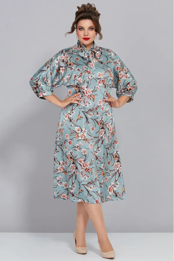 Элегантное женское платье полу-прилегающего силуэта, выполнено из шелкового атласа с принтом. Лиф платья отрезной по линии ниже груди, присборен. Вырез горловины V-образный вырез, с воротником-шалью, которая завязывается спереди. Рукав цельнокроеный, по низу присборен на манжет. Юбка платья расклешенного силуэта, с талиевыми вытачками. Спинка идентична полочке, все платье трикотажной подкладке. Легкое, но в то же время с эффектным принтом платье дополнит ваш образ и придаст романтичности!