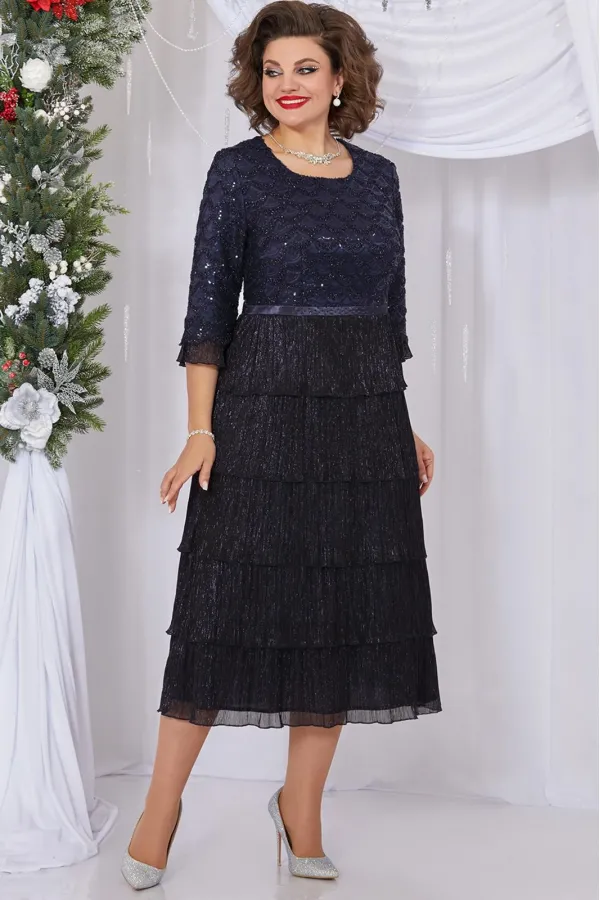 Эффектное женское платье, полу-прилегающего силуэта, выполнено из кружева с подложкой из атласа и плиссированной ткани. Лиф платья отрезной по линии талии, выполнен из кружева, вырез горловины округлой формы, лиф на подкладке из атласа. По линии талии втачной пояс из атласа, декорирован стразами, юбка платья расклешенного силуэта, из плиссированной ткани, состоит из нескольких ярусов, на трикотажной подкладке. Рукав втачной,. выполнен из кружева, с подкладкой из атласа, по низу с присборенной плиссировкой. Спинка идентична полочке, лиф отрезной по линии талии, из кружева на атласе, юбка из плиссированной ткани, в несколько ярусов, в боковом шве потайная молния. Нарядное платье отличный выбор для торжественных мероприятий!