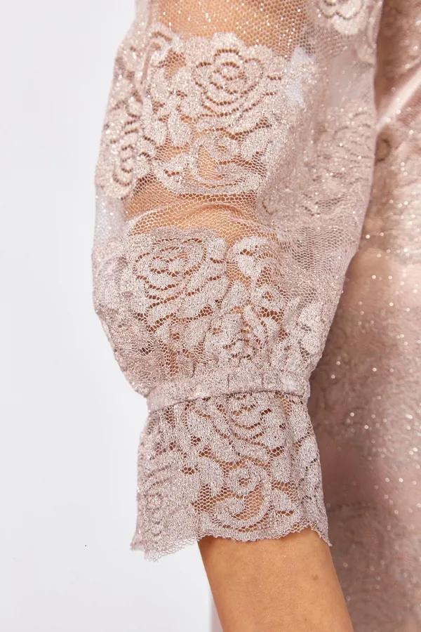 Нарядное женское платье полу-прилегающего силуэта, выполнено из гипюра с глитером и текстиля. Лиф платья отрезной по линии талии, с вытачками, на лифе обработана застежка на петли-пуговицы. Юбка платья прямого покроя, выполнена из гипюра с глитером. Спинка выполнена из однотона (текстиля), со средним швом и вытачками, в среднем шве по низу шлица. Рукав выполнен из гипюра с глитером, расклешенный к низу и присборен на манжет из гипюра. Элегантное платье отличный выбор для вашего образа на любое мероприятие!