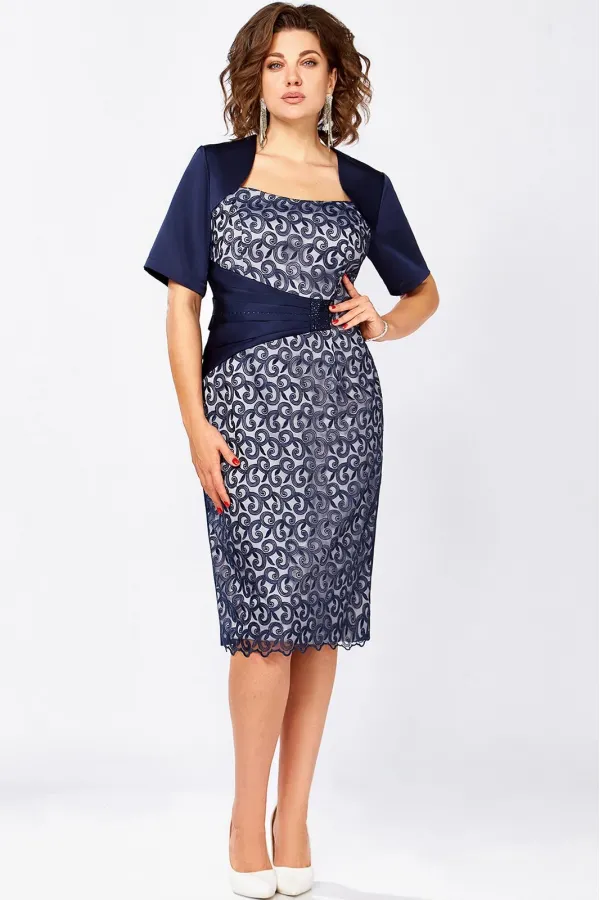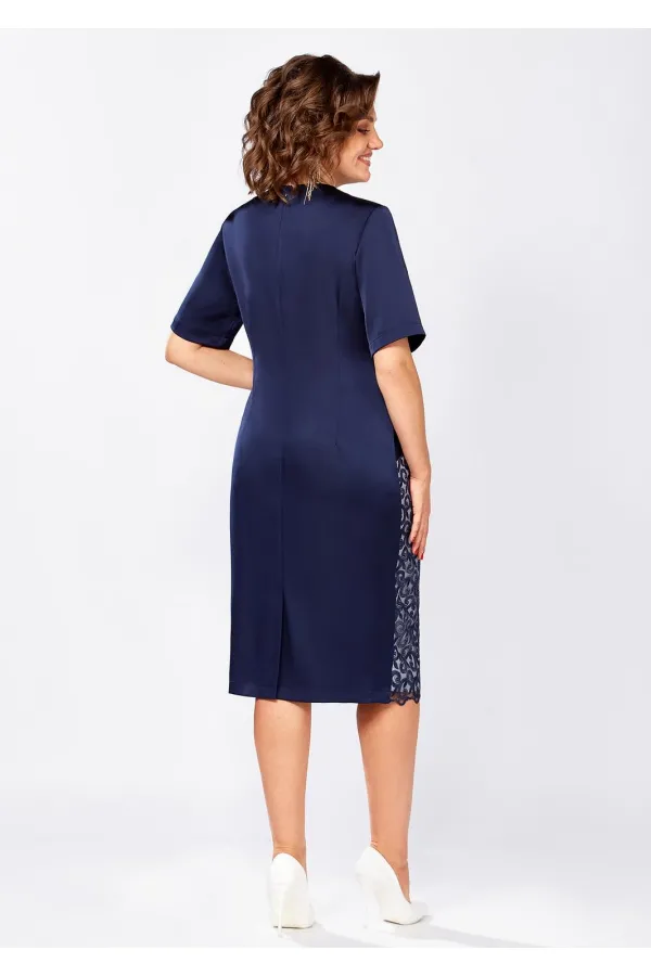 Элегантное женское платье полу-прилегающего силуэта, выполнено из атласа и кружева. На полочке из кружева, обработан втачной пояс из атласа, со складками и втачным элементом, декорированным стразами. Горловина округлой формы, на обтачке, на лифе обработаны кокетки из атласа. Юбка платья выполнена из кружева, заужена к низу. Спинка выполнена из атласа, со средним швом и полурельефами, рукав втачной, укороченный, также из атласа. Нарядное, женское платье с эффектным акцентом по линии талии, отличный выбор для торжественных мероприятий!