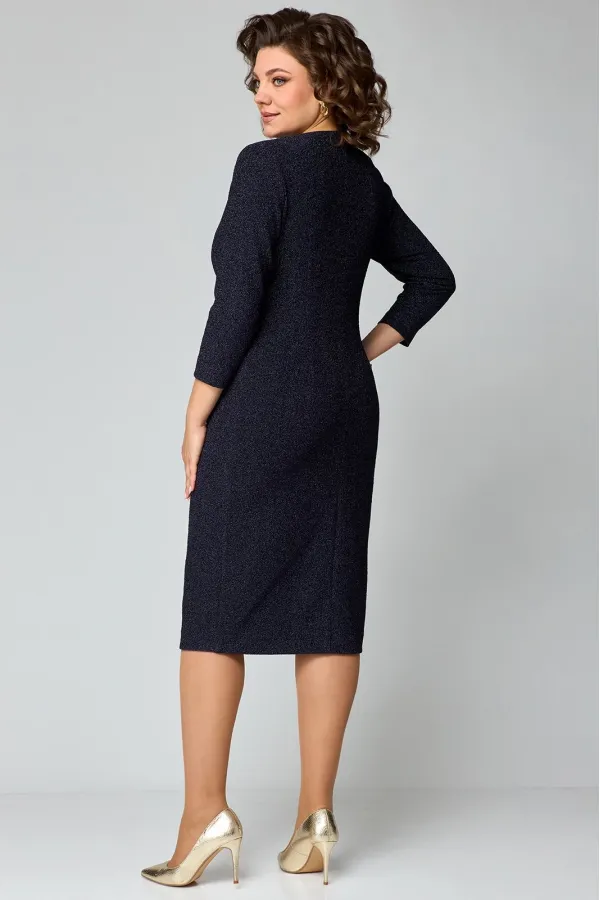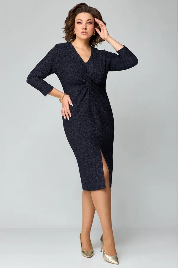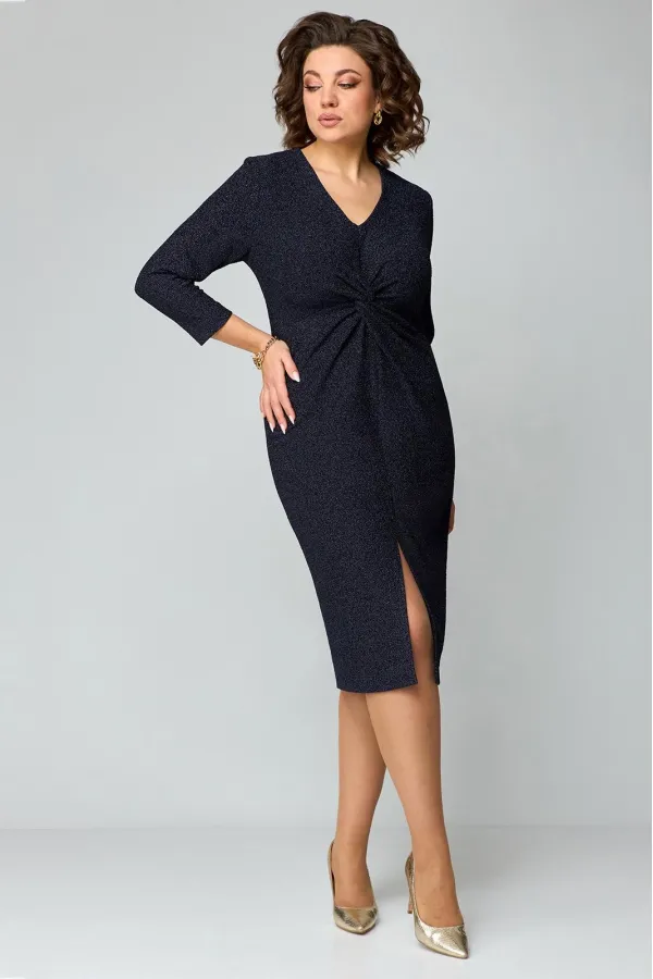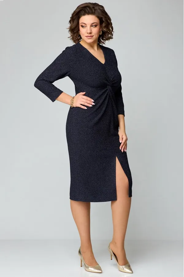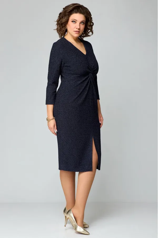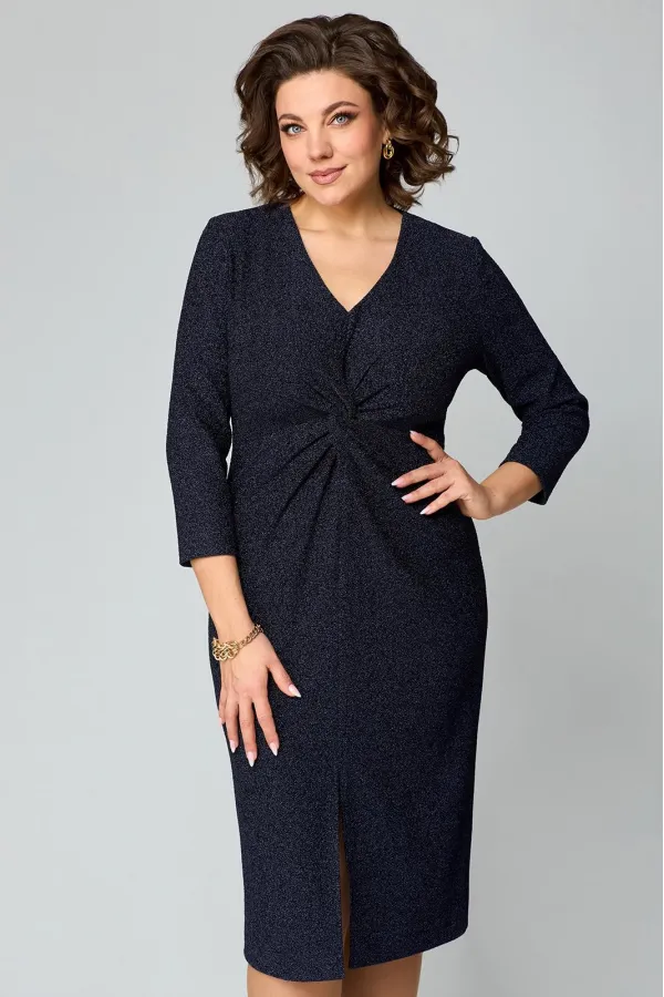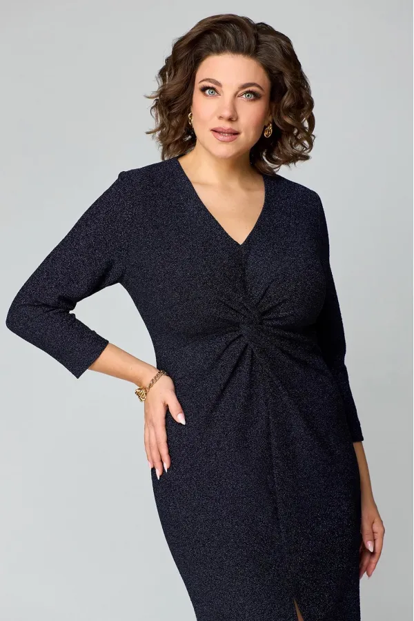 Элегантное женское платье полуприлегающего силуэта из трикотажного полотна с мерцающим блеском.V-образный вырез горловины, по переду имеется средний шов. Отрезная деталь переда по линии груди с имитацией «перекрута». Спинка со средним швом и талиевыми вытачками. Спереди расположен разрез. Рукав втачной, одношовный длиной 7/8.