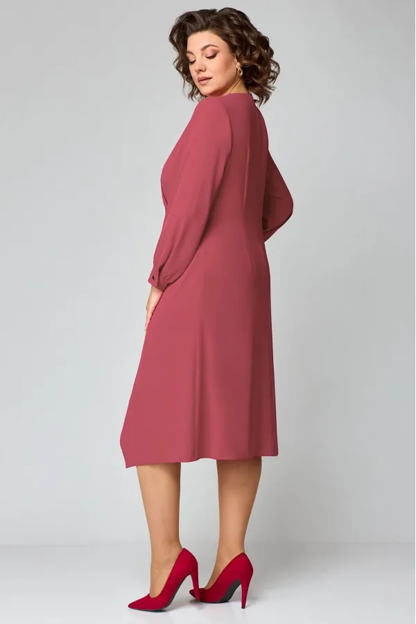 Элегантное женское платье прямого силуэта из легкой струящейся ткани. Перед отрезной по линии талии. Лиф на запах с мягкими складками. Юбка на запах с отлетной деталью. Спинка со средним швом и талиевыми вытачками, застежкой на потайную тесьму-молнию. V-образный вырез горловины. Рукав втачной одношовный присборен по низу на притачной манжете, застегивается на 1пуговицу и петлю. Платье с плечевыми накладками. Платье без подкладки.