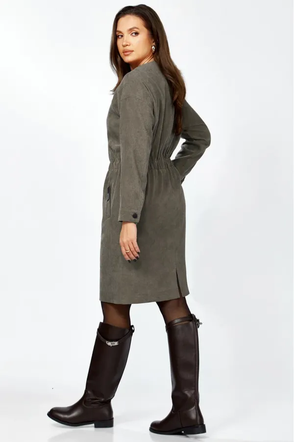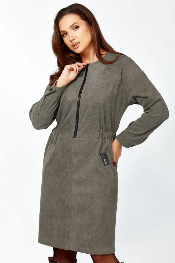 Платье полуприлегающего силуэта из мягкой, комфортной штруксовой ткани. Рукав спущенный, длинный, на манжете с застёжкой на 1 петлю и 1 пуговицу, разрезом. Горловина круглая, застёжка на тесьму-молнию контрастного цвета до талии. По талии подрез, по бокам спереди вставлена резинка, верхняя часть платья имитирует бомбер. Карманы- наклонные листочки, расположены на уровне бёдер по переднему полотнищу юбки, на левой листочке настрочена нашивка контрастного цвета. Перед платья с декоративными подрезами и отстрочкой. Спинка отрезная по талии, на резинке, со средним швом и разрезом по низу.