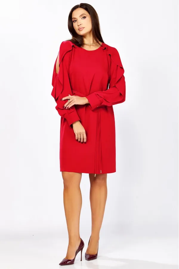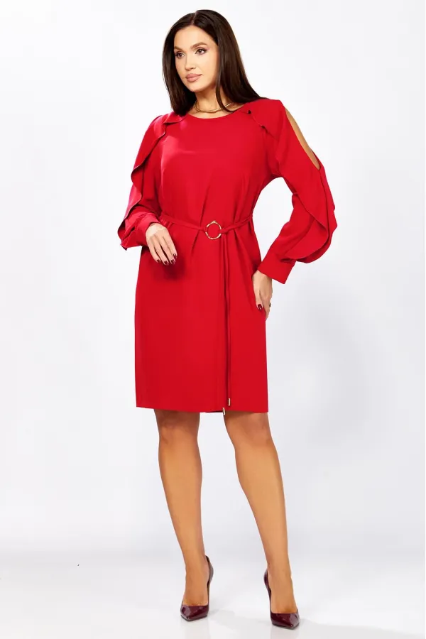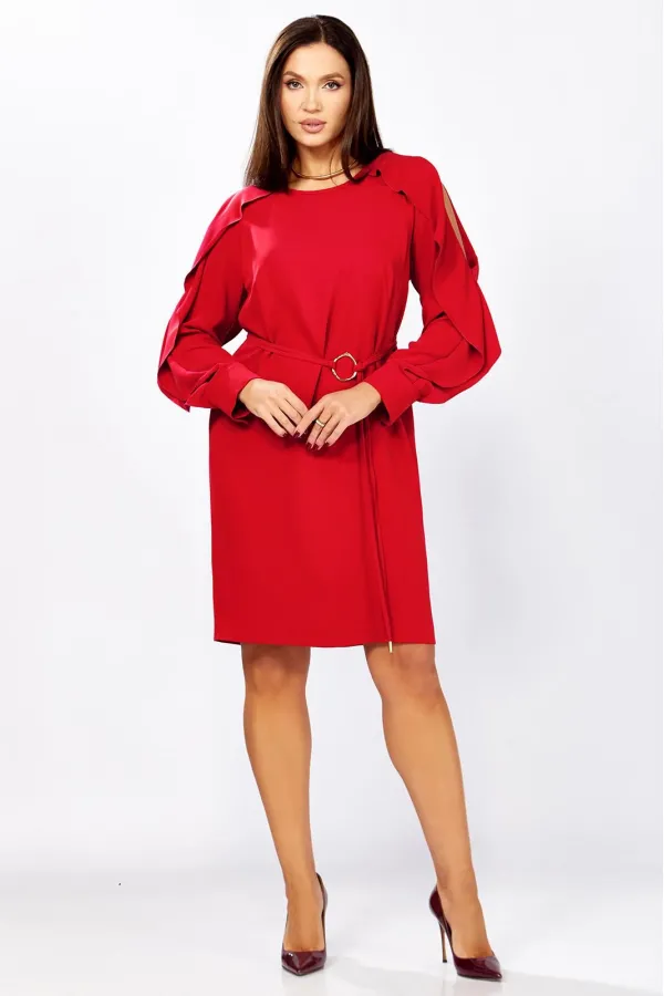 Романтичное платье прямого силуэта, без подкладки. Округлый вырез горловины обработан бейкой. Перед с нагрудной вытачкой. Рукав реглан с вырезом и двумя рюшами. Рукав с манжетой по низу. застегивается на 2 пуговицы и петли. Спинка со средним швом и вырезом «капелька» с завязками на концах с наконечниками. Имеется съемный пояс-завязки с кольцом и наконечниками на концах. Длина рукава от горловины- 69см, длина по синке-97см.