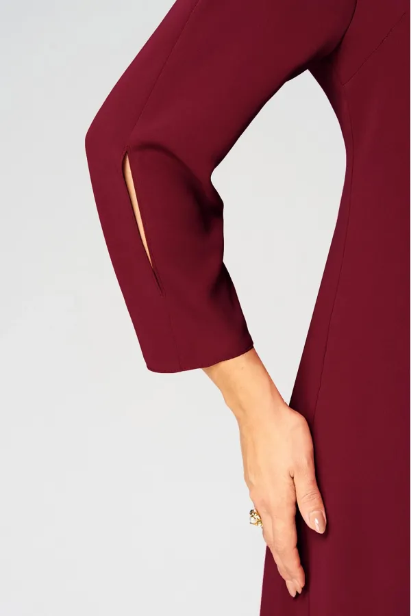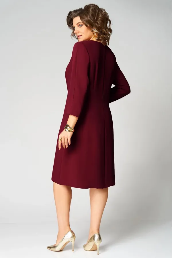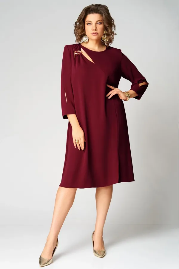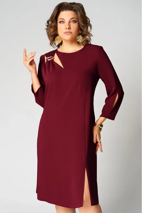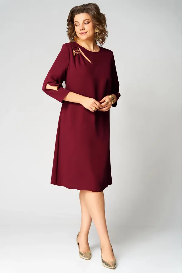 Нарядное платье А- силуэта, без подкладки. Округлый вырез горловины обработан бейкой. Перед с фигурным подрезом и разрезом по низу. По правой стороне переда легкая драпировка с декоративной пряжкой и двумя вырезами. Рукав втачной, двухшовный с вертикальным разрезом в локтевом шве. Спинка со средним швом и застежкой сзади на потайную тесьму-молнию. Длина рукава от горловины- 50 см, длина по синке-104 см.