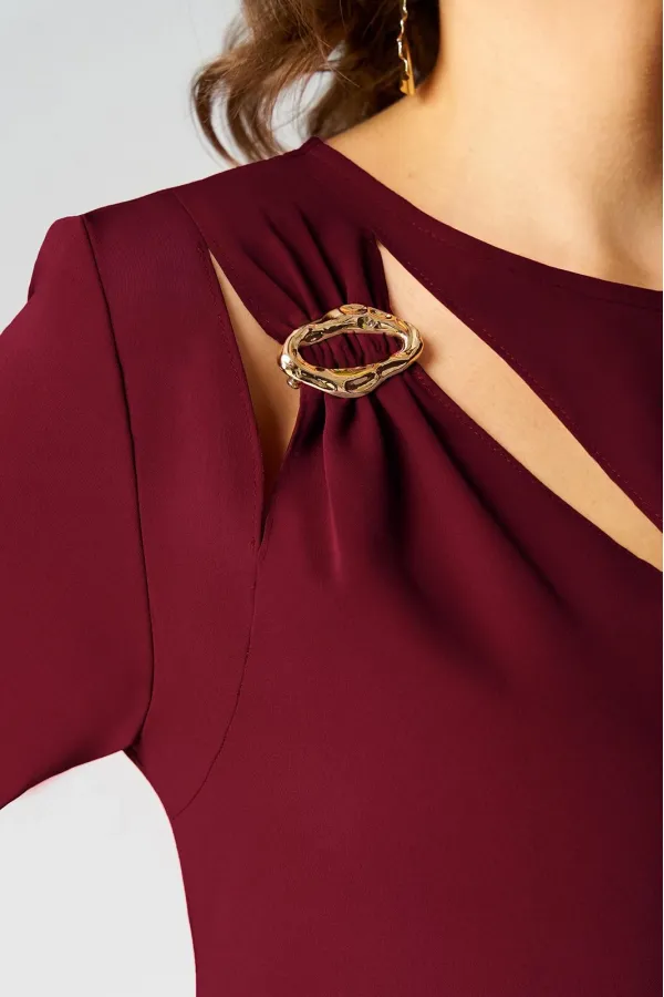 Нарядное платье А- силуэта, без подкладки. Округлый вырез горловины обработан бейкой. Перед с фигурным подрезом и разрезом по низу. По правой стороне переда легкая драпировка с декоративной пряжкой и двумя вырезами. Ру... Читать далее...
