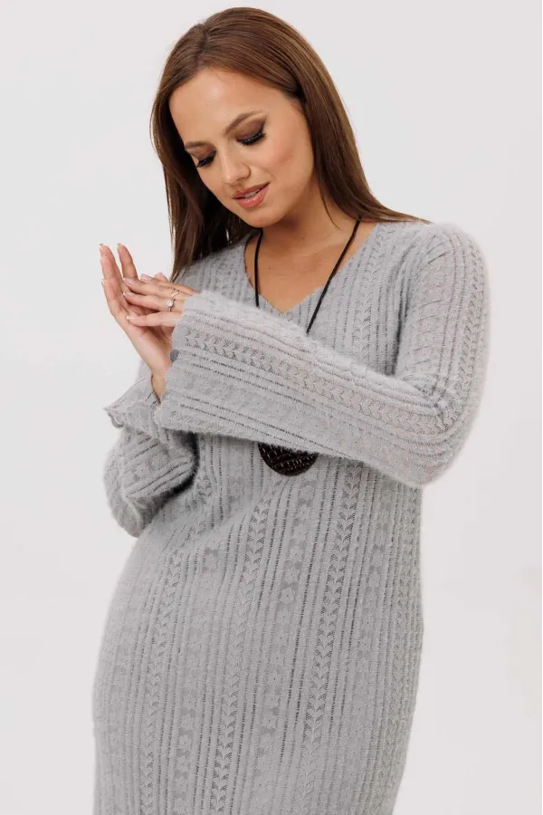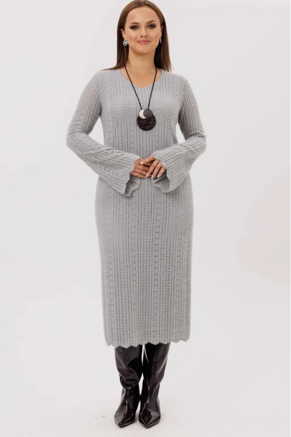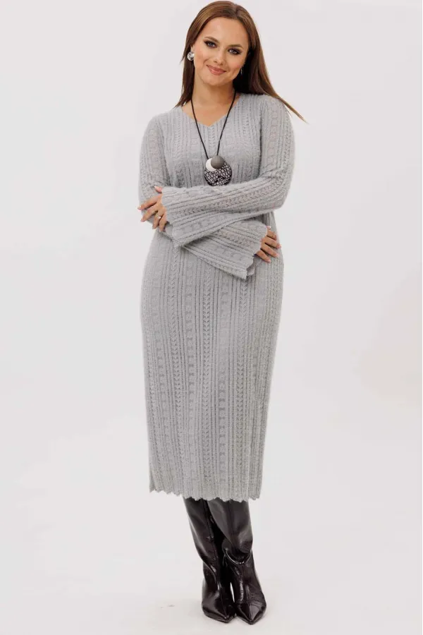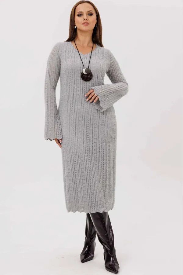 Платье трикотажное на подкладке. Платье выполнено из трикотажного полотна с ажурным (кружевным) рисунком. Полотно средней плотности, эластичное, с мягким прилеганием по фигуре. Изделие полуприлегающего силуэта, длиной миди, с V-образным вырезом горловины и длинным втачным рукавом. Низ рукавов и низа изделия обработан фигурным краем полотна, что придаёт модели завершённый декоративный акцент. Для комфортной посадки предусмотрена трикотажная подкладка по всей длине изделия.