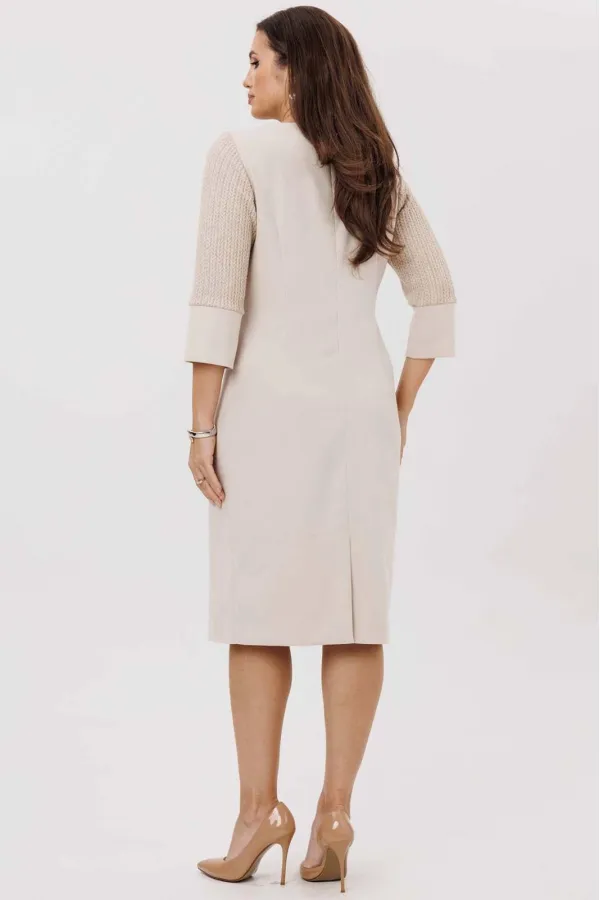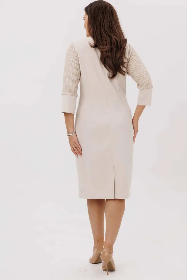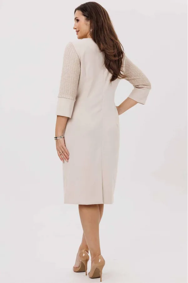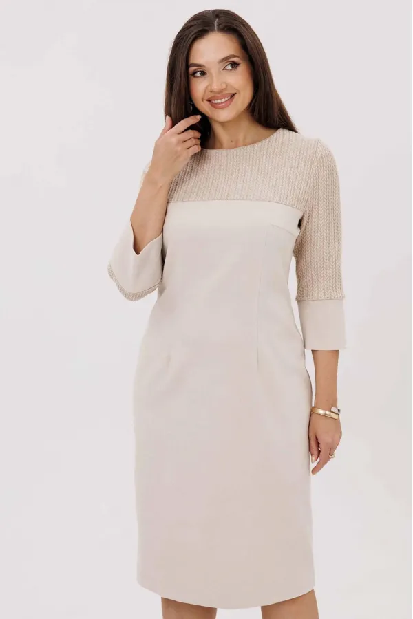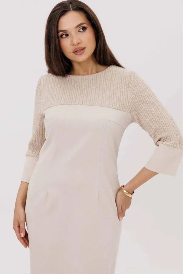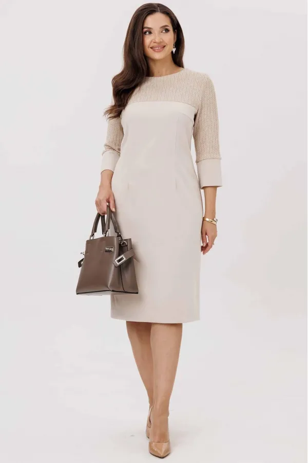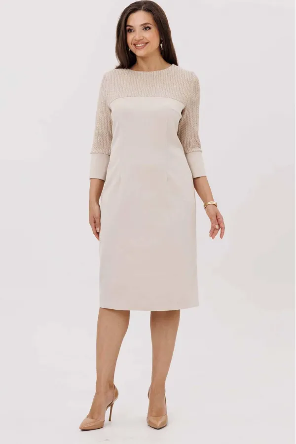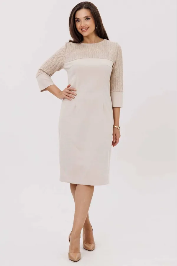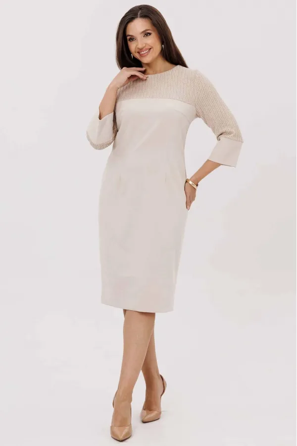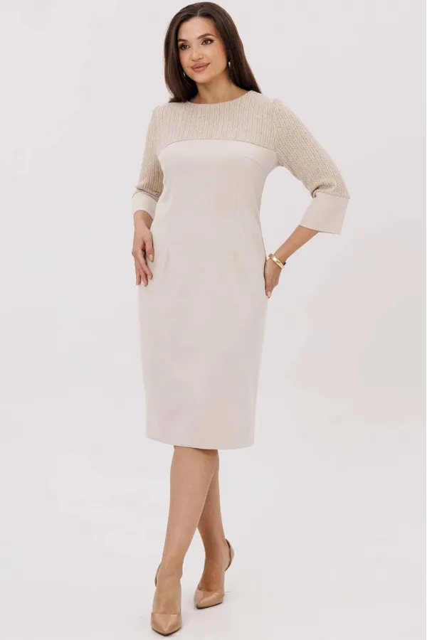 Платье полуприлегающего силуэта. Перед с отрезной кокеткой из отделочной ткани и с нагрудными и талиевыми вытачками. Спинка со средним швом, в который вставлена тесьма-молния). На спинке талиевые вытачки. Средний шов заканчивается шлицей.Рукав одношовный втачной из отделочной ткани с притачным манжетом из основной ткани.