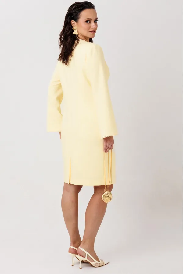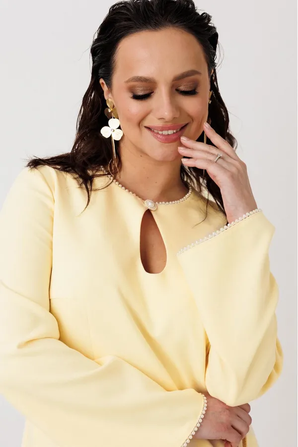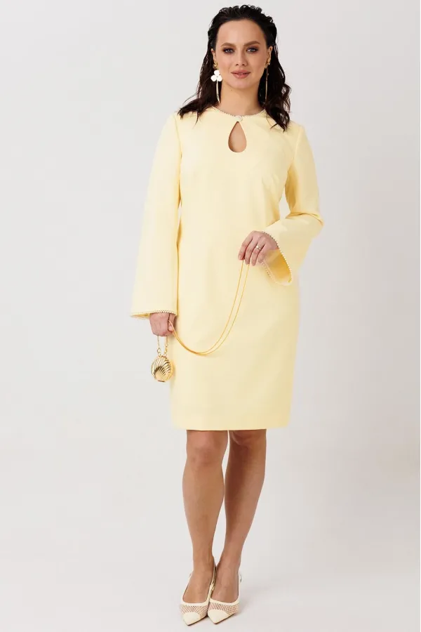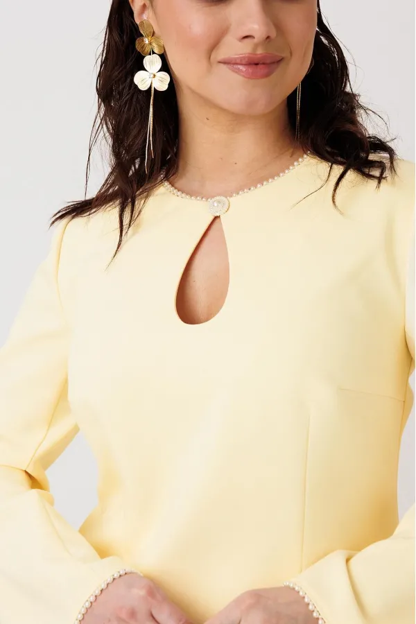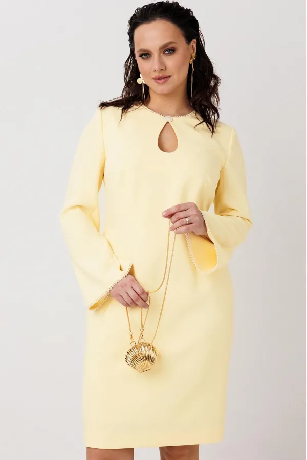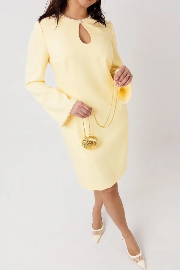 Элегантное платье-футляр, выполненное из плотной плательной ткани на подкладке. Дизайн акцентирован декоративной бейкой с жемчужным оформлением на горловине и манжетах рукавов — технически точная обработка краев, обеспечивающая долговечность и эстетику. Центральная деталь — пуговица-застежка на горловине, формирующая изысканный вырез-капель с эффектом глубины.