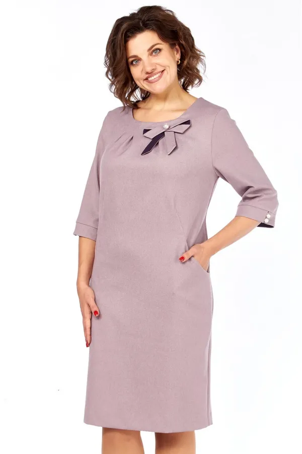 Платье женское прямого силуэта, без подкладки, тесьма-молния в среднем шве спинки. По горловине переда застрочены 4 встречные складки. По переду обработан подрез от бокового шва, переходящий в вытачку, в шов вставлен боковой карман. Спинка со средним швом, переходящим в шлицу, талиевые вытачки. Горловина обработана обтачкой. Рукав одношовный, втачной, притачная манжета с разрезом, застегивается на две навесные петли и пуговицы. Слева по горловине переда пришит бант. Обтачка горловины переда и спинки, нижняя часть банта, нижняя часть хвостиков банта, нижняя часть манжеты из отделочной ткани. В качестве отделки по центру банта пришито украшение.