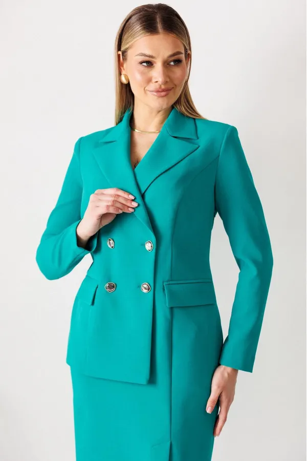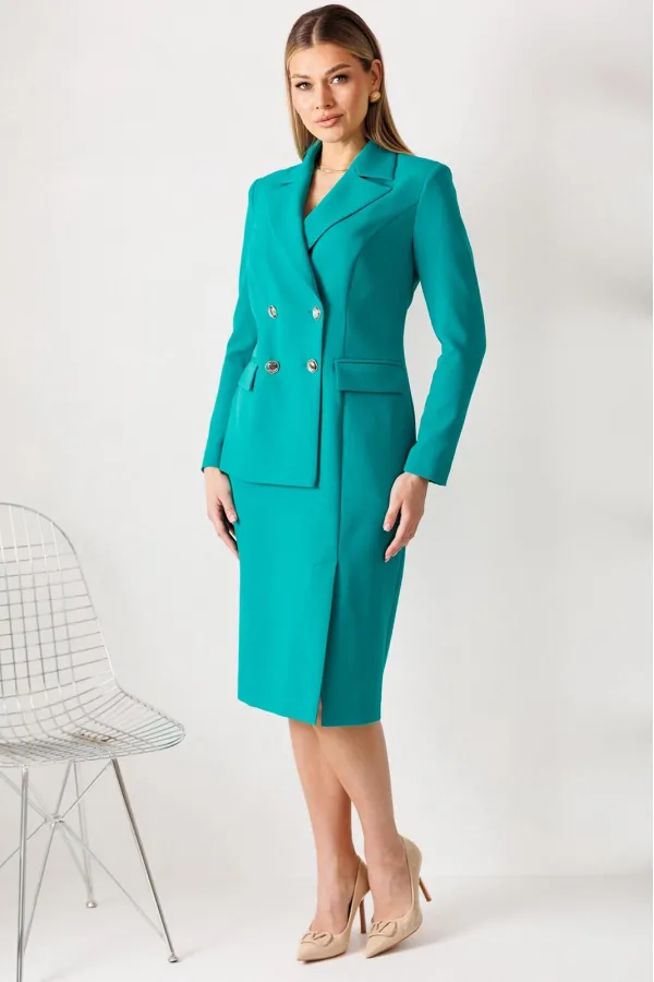 Сомневаетесь, выбрать для важной встречи строгий костюм или элегантное платье? Предлагаем блестящий компромисс! Платье-блейзер полуприлегающего силуэта, длиной ниже колена. Имитация жакета придаёт деловой стиль. Воротник пиджачного типа. Застёжка двубортная на 2 пары пуговиц, в левом боковом шве- потайная молния. На полочке присутствует рельеф из проймы до низа,в котором обработана шлица, обработаны карманы «в рамку с клапаном». Спинка со средним швом и талевыми вытачками. Рукава длинные, двушовные. Платье частично на подкладке. Вы получаете весь эффект от сложного ансамбля, минуя лишние сложности. Платье подчеркивает Ваш статус и деловой настрой.