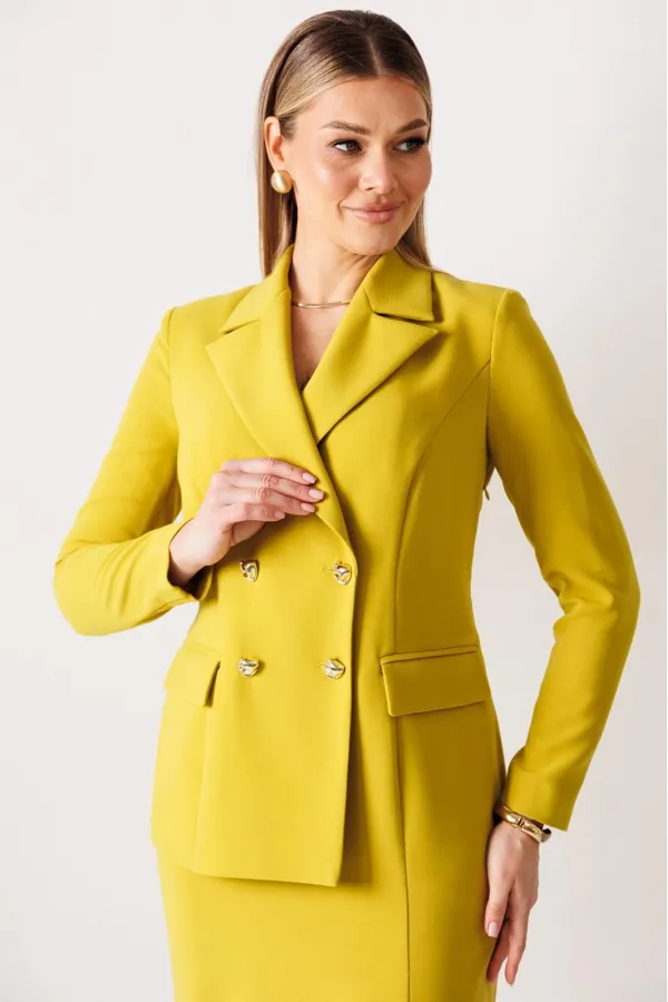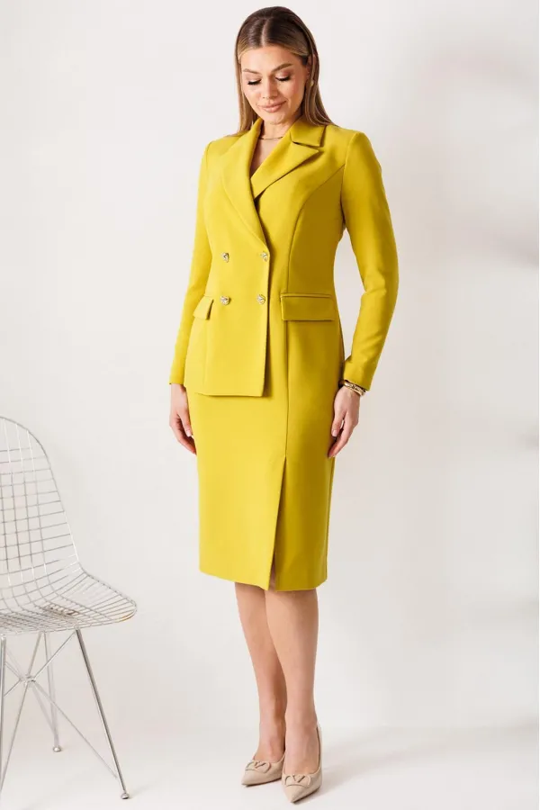 Сомневаетесь, выбрать для важной встречи строгий костюм или элегантное платье? Предлагаем блестящий компромисс! Платье-блейзер полуприлегающего силуэта, длиной ниже колена. Имитация жакета придаёт деловой стиль. Воротник пиджачного типа. Застёжка двубортная на 2 пары пуговиц, в левом боковом шве- потайная молния. На полочке присутствует рельеф из проймы до низа,в котором обработана шлица, обработаны карманы «в рамку с клапаном». Спинка со средним швом и талевыми вытачками. Рукава длинные, двушовные. Платье частично на подкладке. Вы получаете весь эффект от сложного ансамбля, минуя лишние сложности. Платье подчеркивает Ваш статус и деловой настрой.