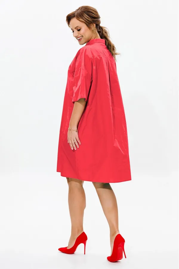 Платье свободного прямого силуэта «оверсайз», выполненное из тафты (не тянется). По переду рельефные швы, накладные карманы. По спинке кокетка и встречная складка для свободы движения. Рукава одношовные. Горловина оформлена воротником-стойкой. Застежка на отрезную планку, на петли-пуговицы.