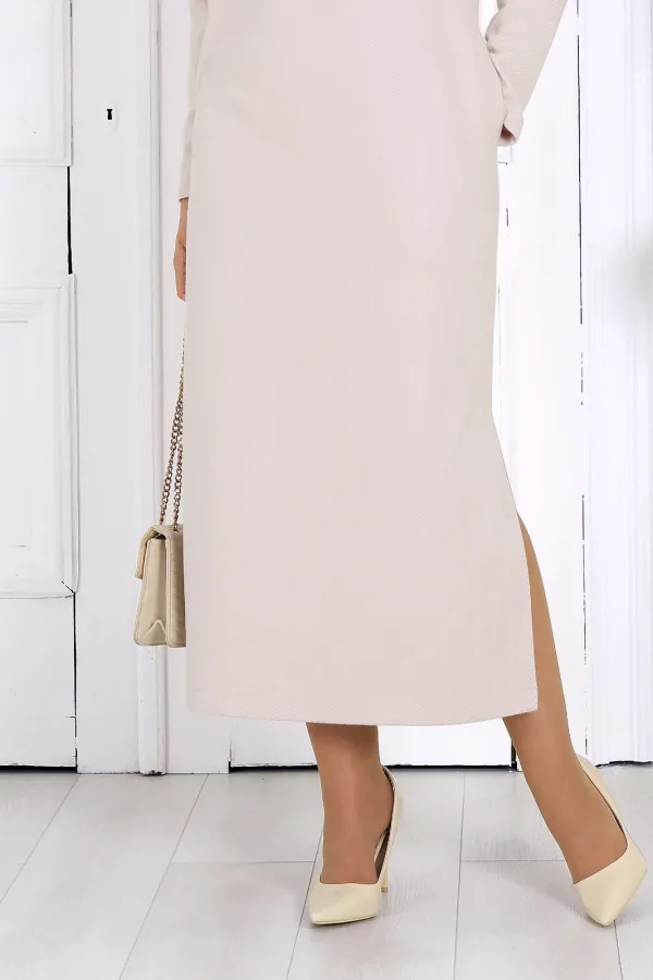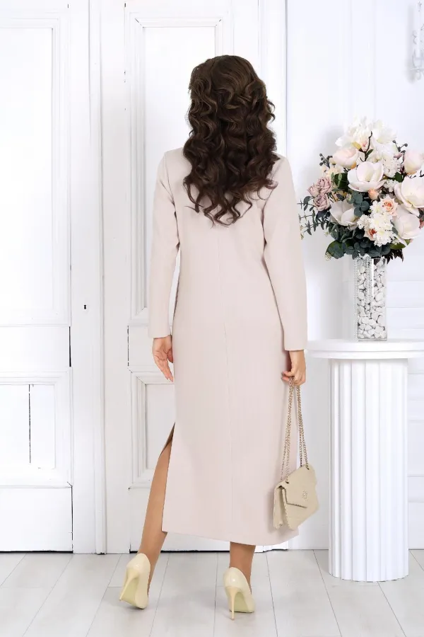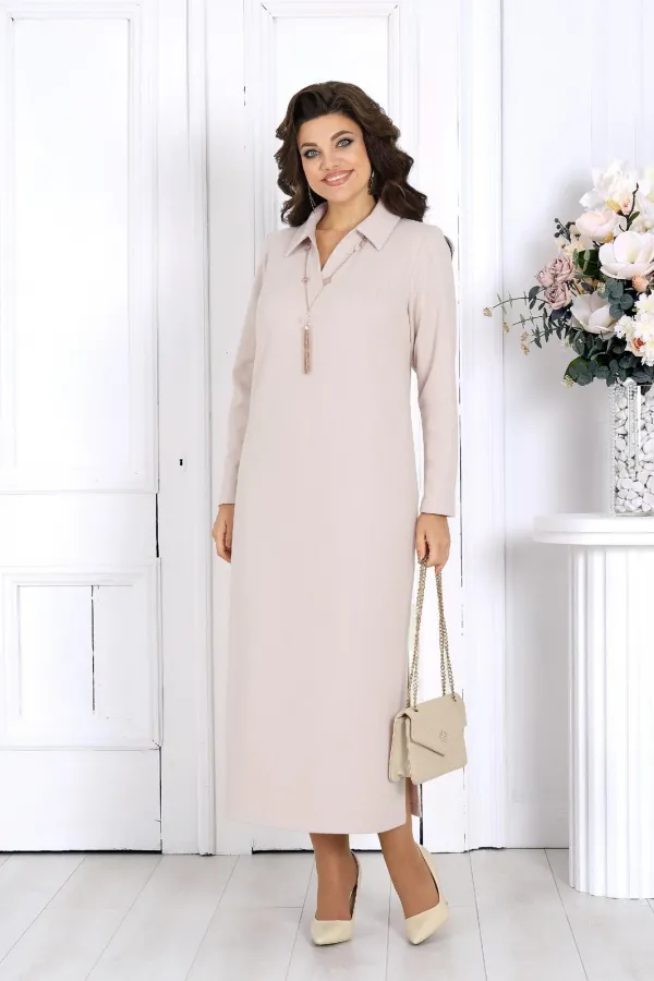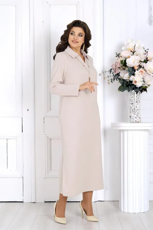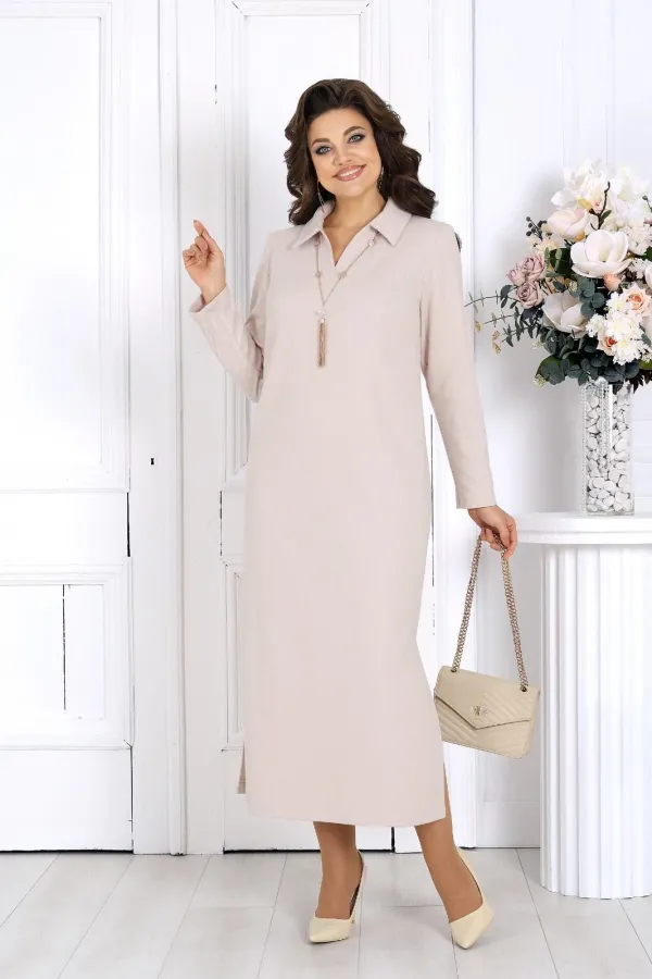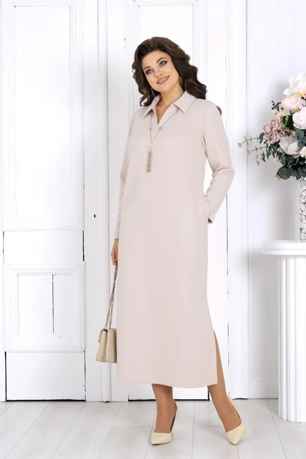 Платье женское, прямого силуэта, расширенное к низу, выполнено из трикотажного полотна. Платье женское прямого силуэта, длиной по среднему шву спинки 124 см, от шва втачивания воротника. Перед платья с нагрудными вытачками из проймы. Спинка со средним швом. В боковых швах обработаны карманы и разрезы. Воротник рубашечного типа, по переду планка «поло». Рукав втачной, одношовный, длиной 60 см. Платье без подкладки.