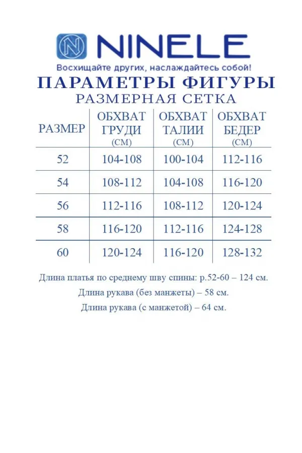 Длина платья-124 см; длина рукава (без манжеты)-58 см; длина рукава (с манжетой)-64 см.