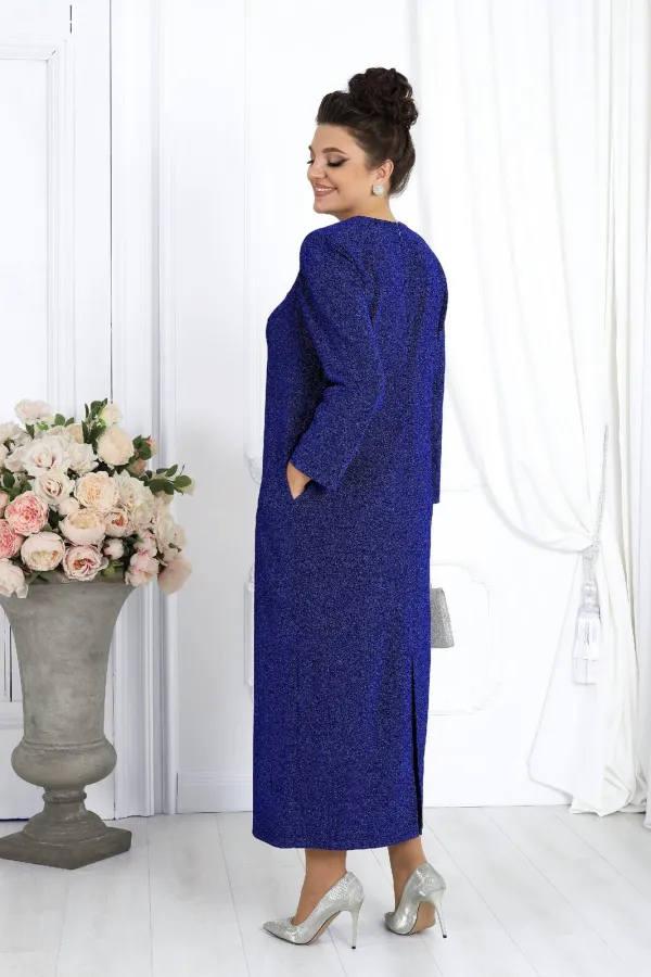Платье женское полуприлегающего силуэта, выполнено из трикотажного полотна с фактурной лицевой стороной «люрекс». Модель с карманами в боковых швах, на трикотажной подкладке, с плечевыми накладками. Перед с нагрудными вытачками, направленными от пройм. В верхней части среднего шва спинки расположена застежка на тесьму-«молнию» (50 см), в нижней - разрез. Круглая горловина оформлена съемным воротником, декорированным спереди пришивными камнями. Рукав длинный, втачной, низ оформлен съемной манжетой с разрезом. Воротник и манжеты выполнены из сатина и пристегиваются к изделию при помощи прорезных петель и пуговиц.