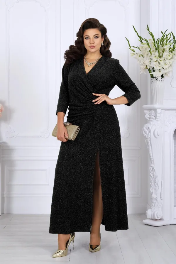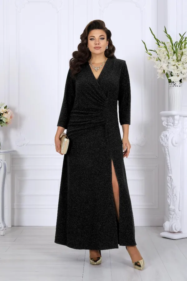 Асимметричный перед с запахом и деликатными драпировками визуально стройнит и формирует правильный силуэт для женщин с формами. Глубокий разрез добавляет образу легкой смелости, оставаясь элегантным и уместным на торжественных мероприятиях.