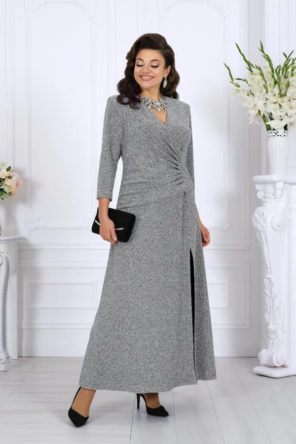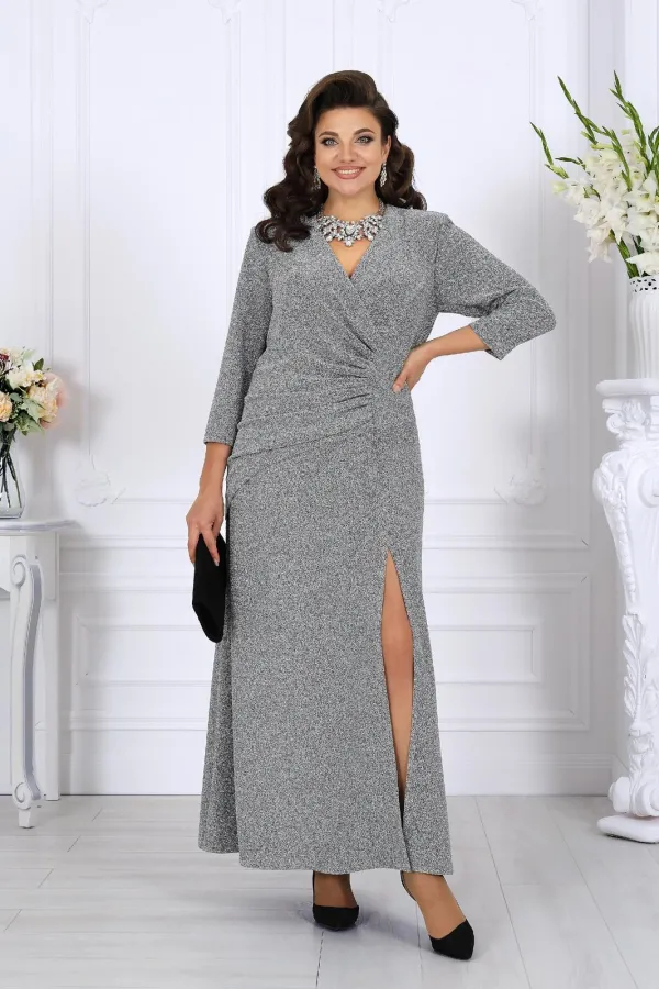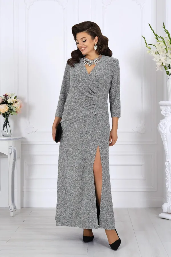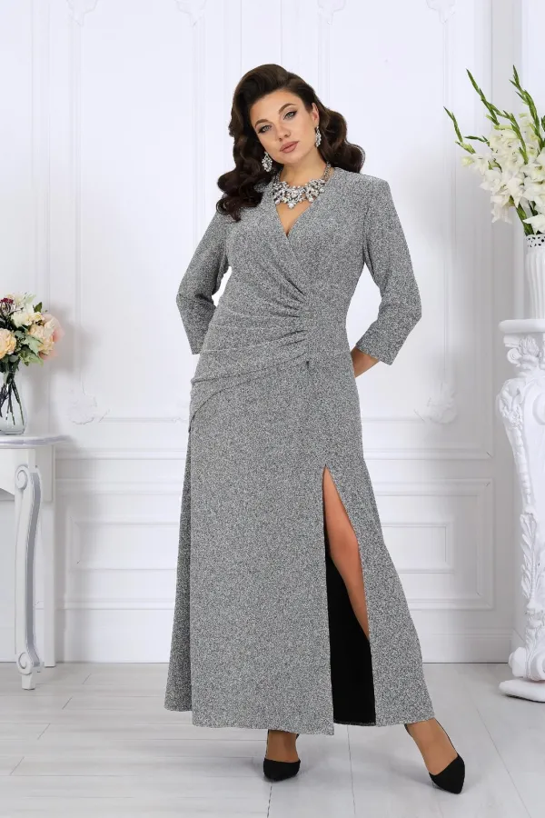 Асимметричный перед с запахом и деликатными драпировками визуально стройнит и формирует правильный силуэт для женщин с формами. Глубокий разрез добавляет образу легкой смелости, оставаясь элегантным и уместным на торжественных мероприятиях.