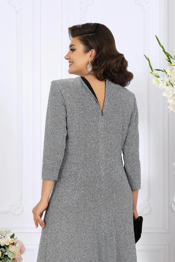 Платье женское, расширенное к низу, выполнено из трикотажного полотна с фактурной лицевой стороной «люрекс». Модель на трикотажной подкладке, с плечевыми накладками. Перед платья асимметричный, состоит из двух деталей, скрепленных на запах. На левой детали переда обработан рельефный шов с разрезом по низу. Правая деталь переда задрапирована сборкой и входит в рельеф на участке между двумя горизонтальными подрезами боковой части переда. На спинке обработаны талиевые вытачки и средний шов с застежкой на потайную тесьму-«молнию» (50 см). Рукав трехчетвертной. Длина платья – 137 см. Длина рукава – 47 см