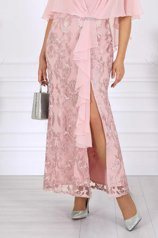 Основу платья составляет комбинация двух слоев: нижний – гладкий сатин, придающий силуэту глубину и плотность, верхний – изысканный гипюр с утончённым цветочным узором. Такое сочетание смотрится дорого и нарядно, создавая эффект объема и игры фактур. Юбка-годе мягко расширяется к низу, формируя стройный и плавный силуэт, а изящный разрез добавляет образу легкую смелость и кокетство.